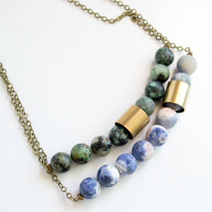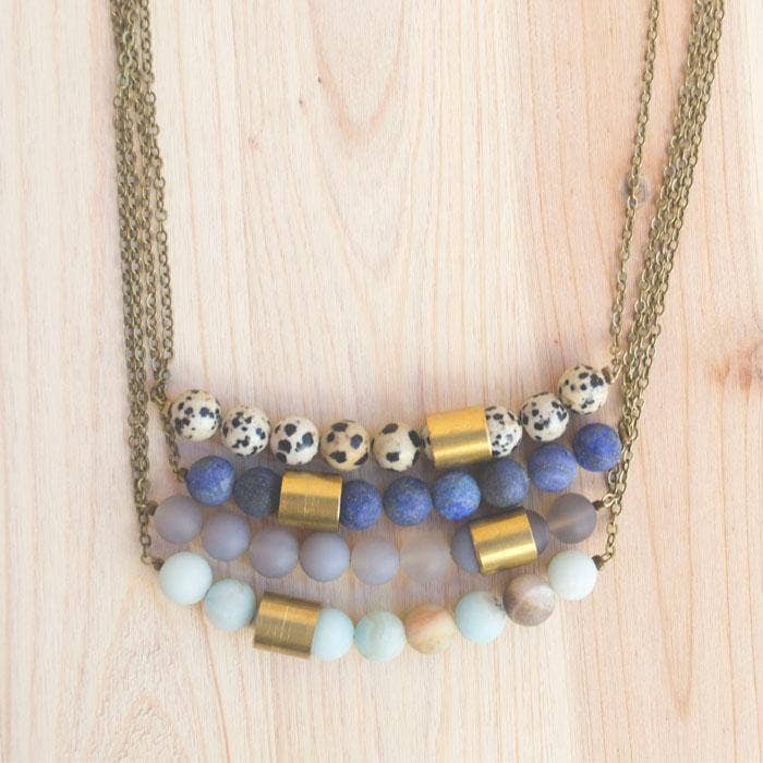 I strive to make jewelry that is simple, fun, and affordable. My style changes and evolves over time, but certain elements remain the same. I call this necklace "Movement and Sound". A Cylindrical Brass bead changes its position as it slides over the beads as you move. Details: 16" Antique brass chain and 4" of gem beads. Available in: Amazonite, Matte Grey Agate, Dalmatian Jasper, and Lapis Lazuli