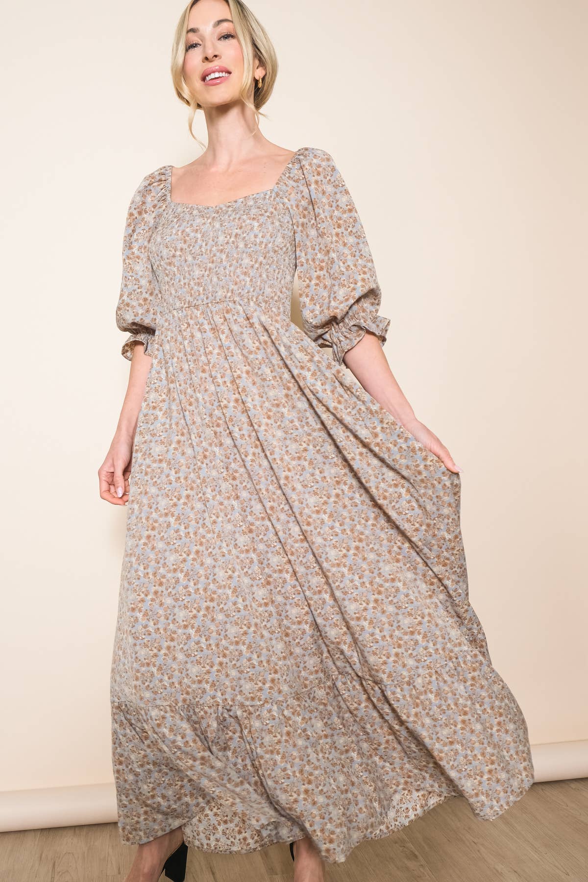 This womenās leopard print maxi dress blends wild charm with refined ease. Featuring a square neckline, long sleeves with smocked openings, and a smocked chest for a flattering fit, it moves beautifully with its wide flare skirt. Finished with side pockets, itās the perfect mix of fierce style and everyday comfort for fall and winter. Tiny Leopard Prints Smocked Sleeve opening Square Neck Smocked chest Side Pockets Wide Flare Skirt