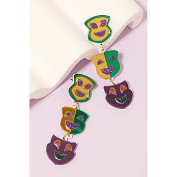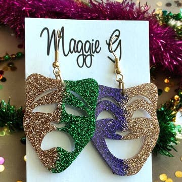 These are made with real guitar picks. That means that the back of the guitar picks may have the emblem of the guitar pick company printed on it. I also used silver toned metal theater (comedy and drama) mask charms. They are 2.25 inches long from the top of of the ear wire curve to the very bottom of the whole earring, and they have surgical steel earwires (nickel free, hypoallergenic). To get an idea of how long the earrings will be on you, start from where your ear is pierced and measure down. All of my jewelry and accessories are handmade by me (Bethany) or Jennifer. Made in and shipped from Lubbock, TX. USA