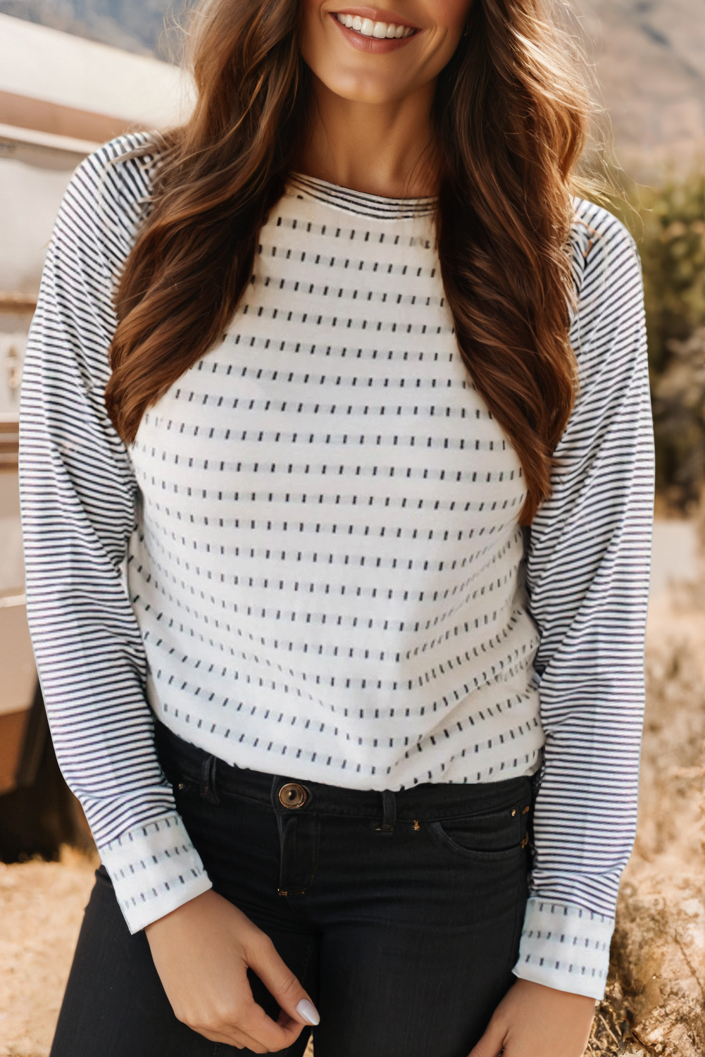 Solid Thermo Basic Baseball T Shirt with Colorblocked Sleeve Model/Picture information Height: 5'8 US Size: 2 Bust: 33" Waist: 25" ** Model wears a size small** *** ALL accessories are not included***