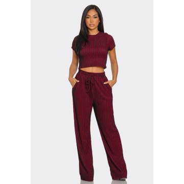 SKU : ISET-1A *** New Style *** The set featuring a sleeveless crop top, wide-leg pants, elasticized waistband. -Winkled Textured fabric COLOR MAY VARY SLIGHTLY DUE TO MONITOR RESOLUTION 92%Polyester 8%Spandex