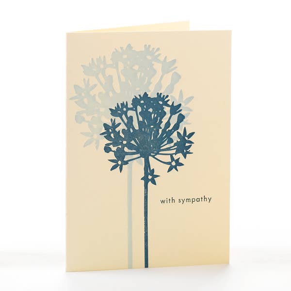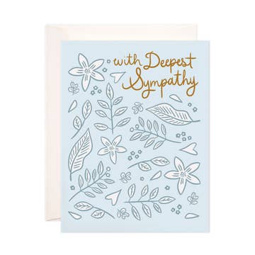 Hand-drawn illustration letterpress card with greetings "with Deepest Sympathy" 100% Cotton paper, white Folded A2, 5.5 x 4.25 inches Blank interior Comes with a white A2 envelope Packaged in a clear biodegradable sleeve This greeting card was printed with love using the Chandler and Price antique letterpress machine built in 1902. Each color is hand fed through the press. Printed in customized vibrant colors with rubber-based ink. Color may vary from photos to printed products.