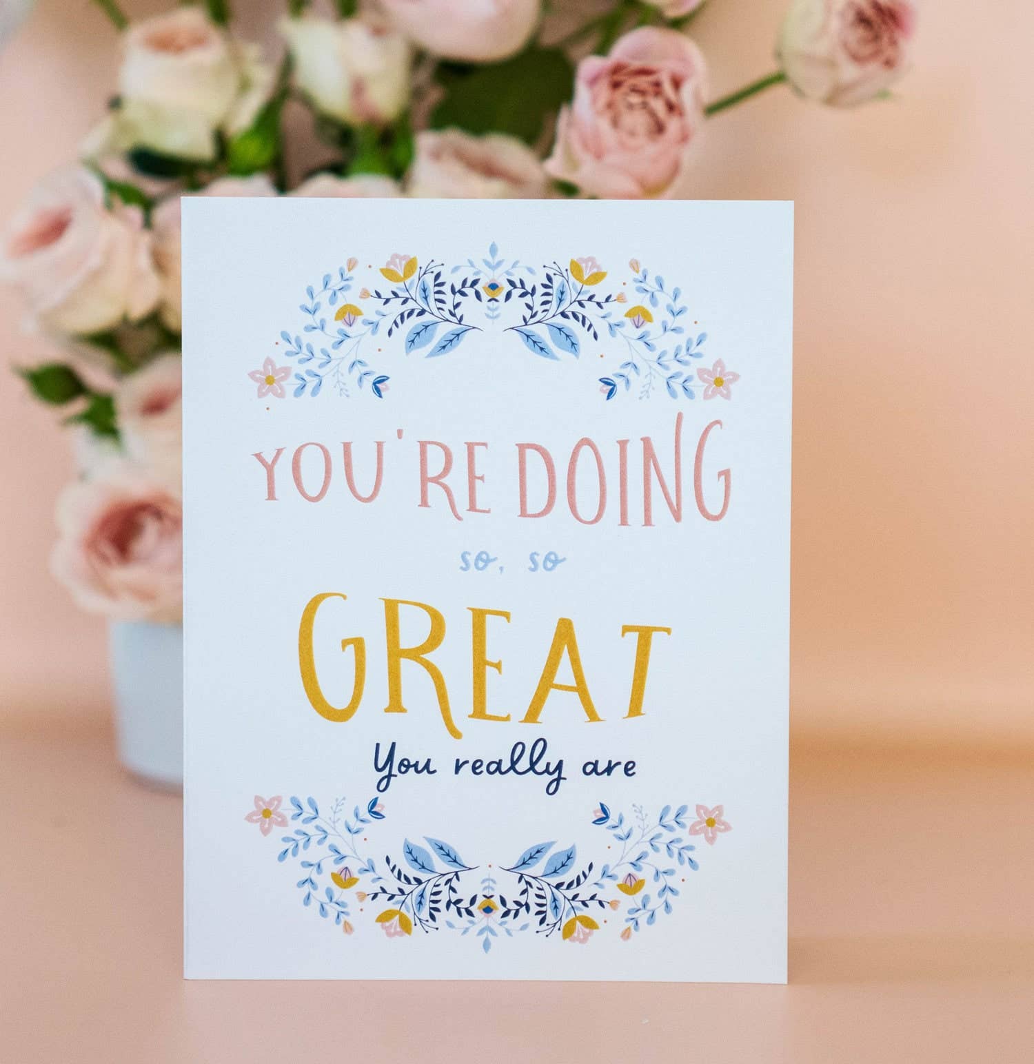 Our Sending Uplifting Thoughts card features a hand-painted and hand-lettered illustration by Thimblepress founder, Kristen Ley. Each card is A2 size and paired with a matching envelope