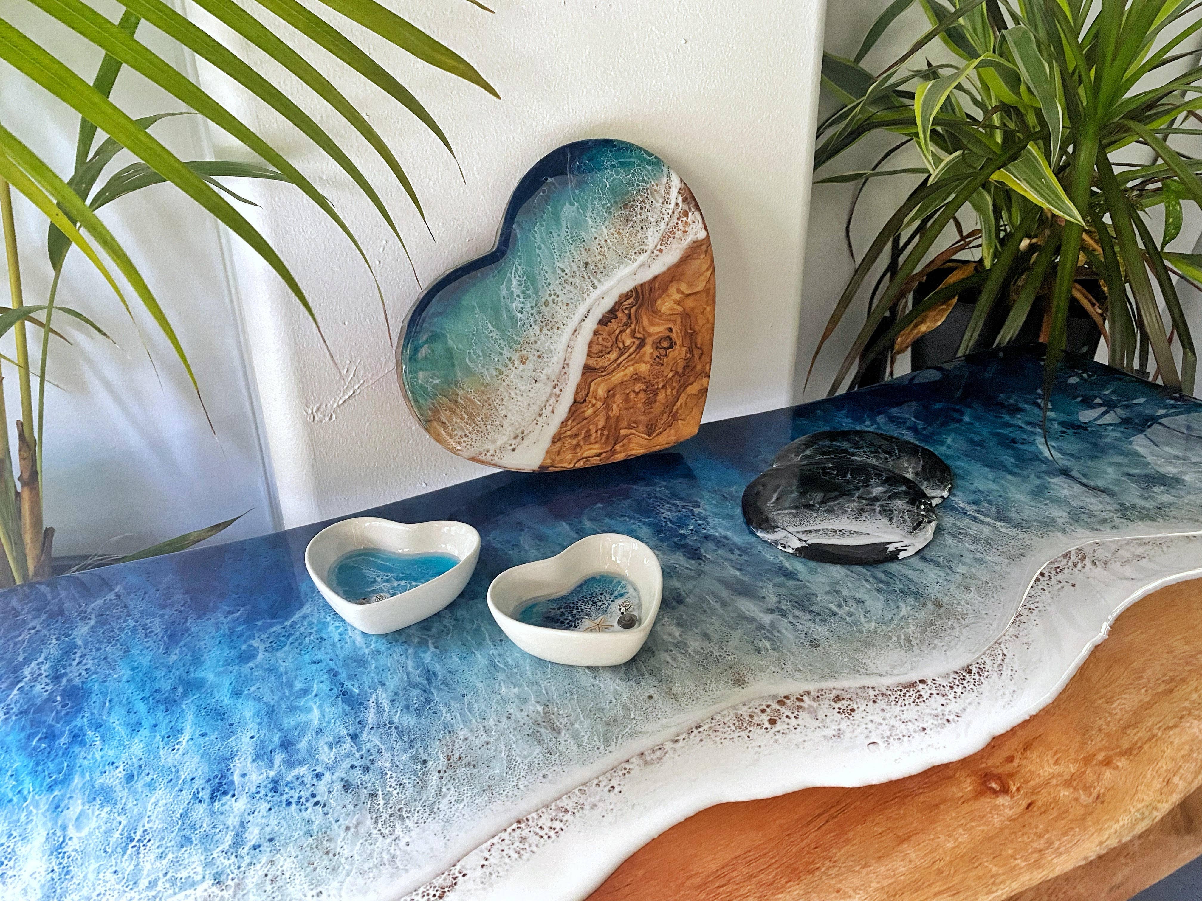 This stunning resin charcuterie board with our Whale & Aloha engraving and a captured ocean scene will bring Aloha feelings to any home and kitchen! Made with food-safe, non-toxic resin - right here on Maui. We're all about green choices! We recommend turning the small boards around for any cutting, so that the cutting can happen on the back of the board, and the presenting during gatherings can happen on the front of the boards with the Ocean features - 2 in 1! Care Instructions: Simply wipe with a damp cloth and some dish soap. Scrubbing or dishwasher use is NOT RECOMMENDED. Heat resistant up to 300 degrees. Please do NOT cut on the part of the resin, as it will scratch. MEASUREMENTS: The smaller board size is SMALL and approximately 8 x 6 inches. The medium board size is approximately 11 x 8 inches. The large size is 11x14.5 inches.