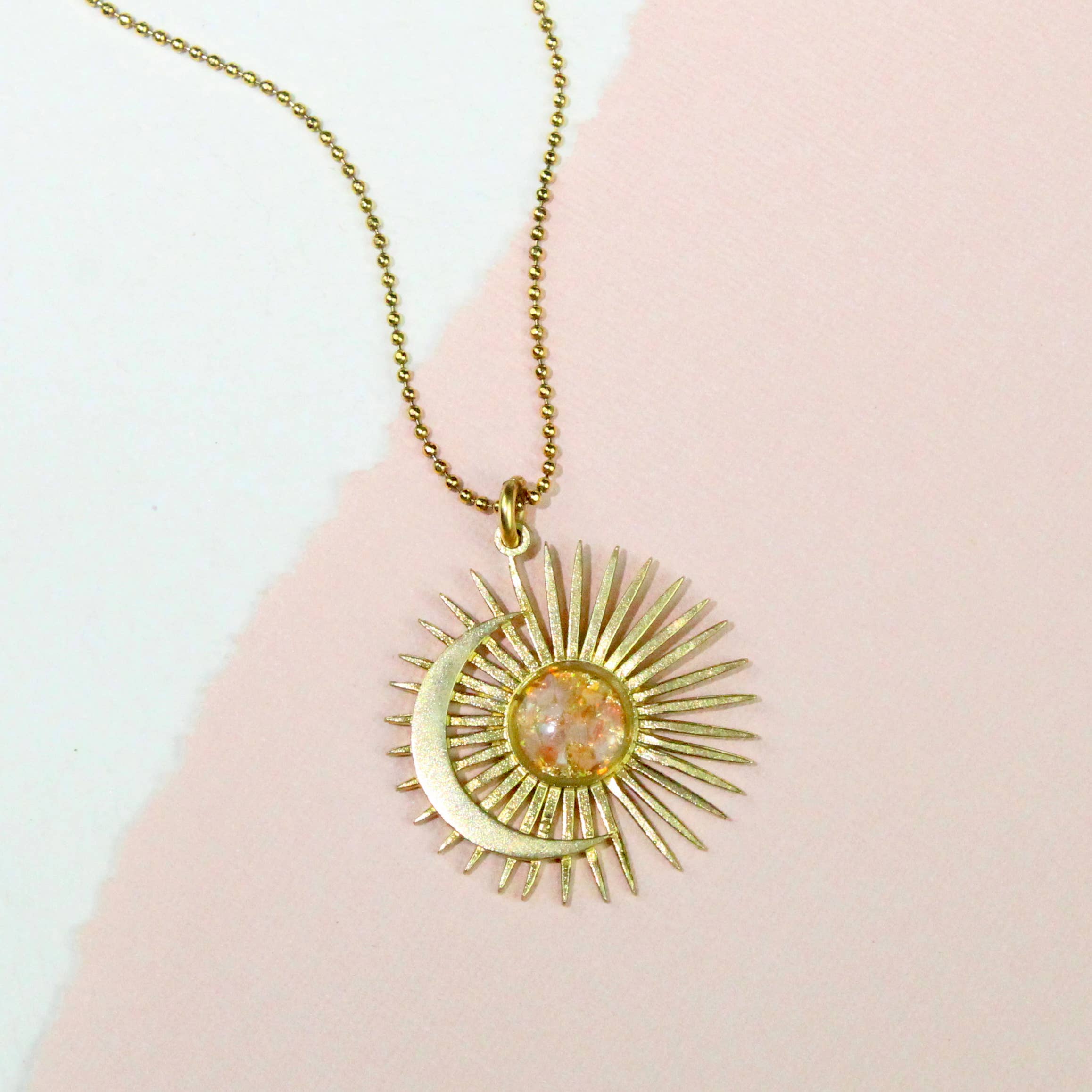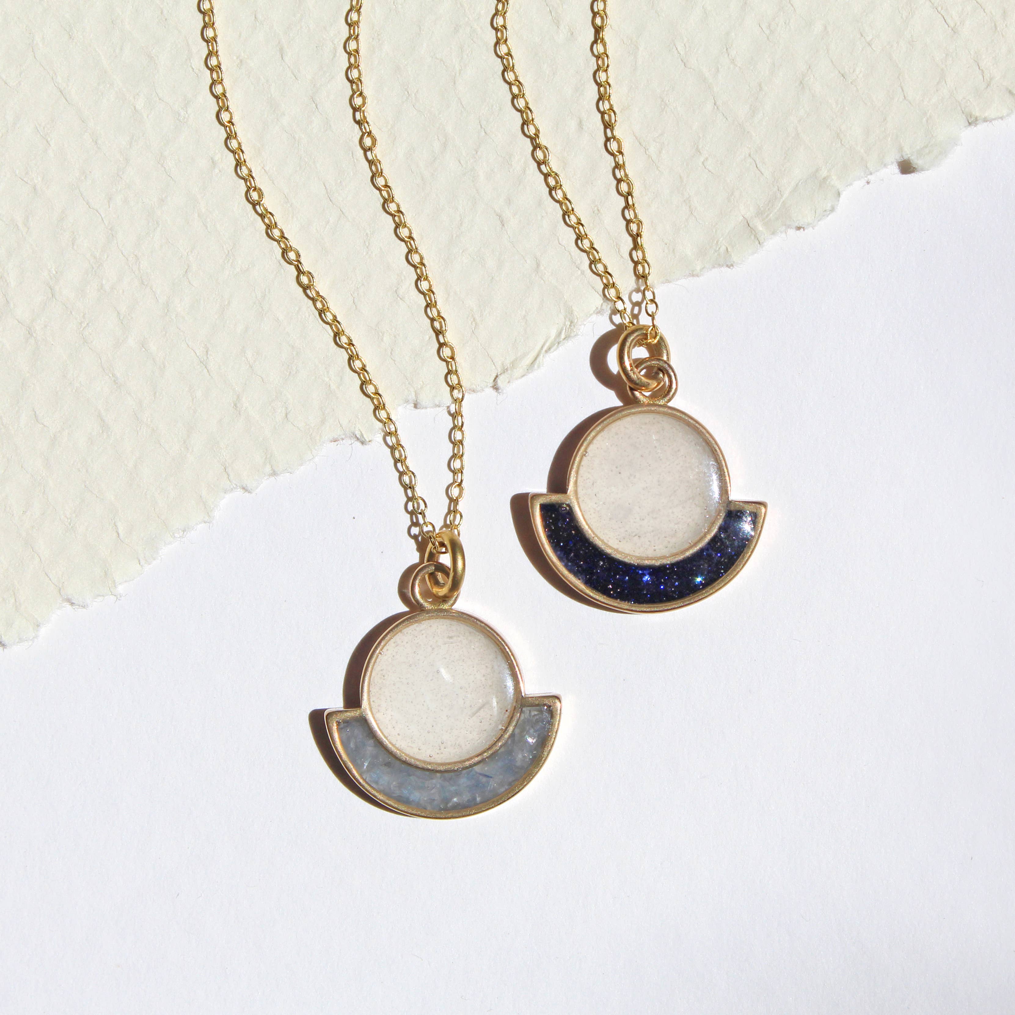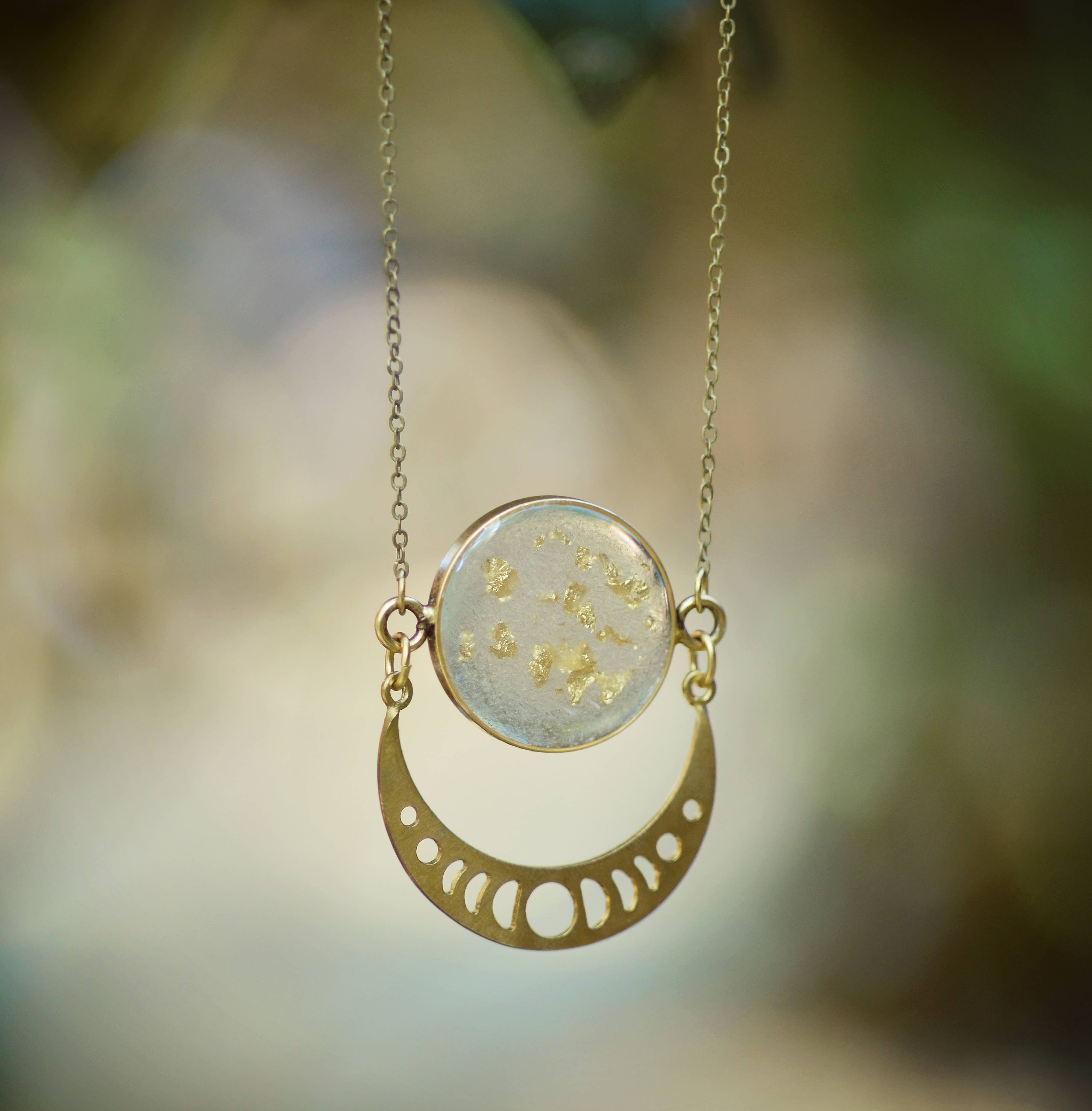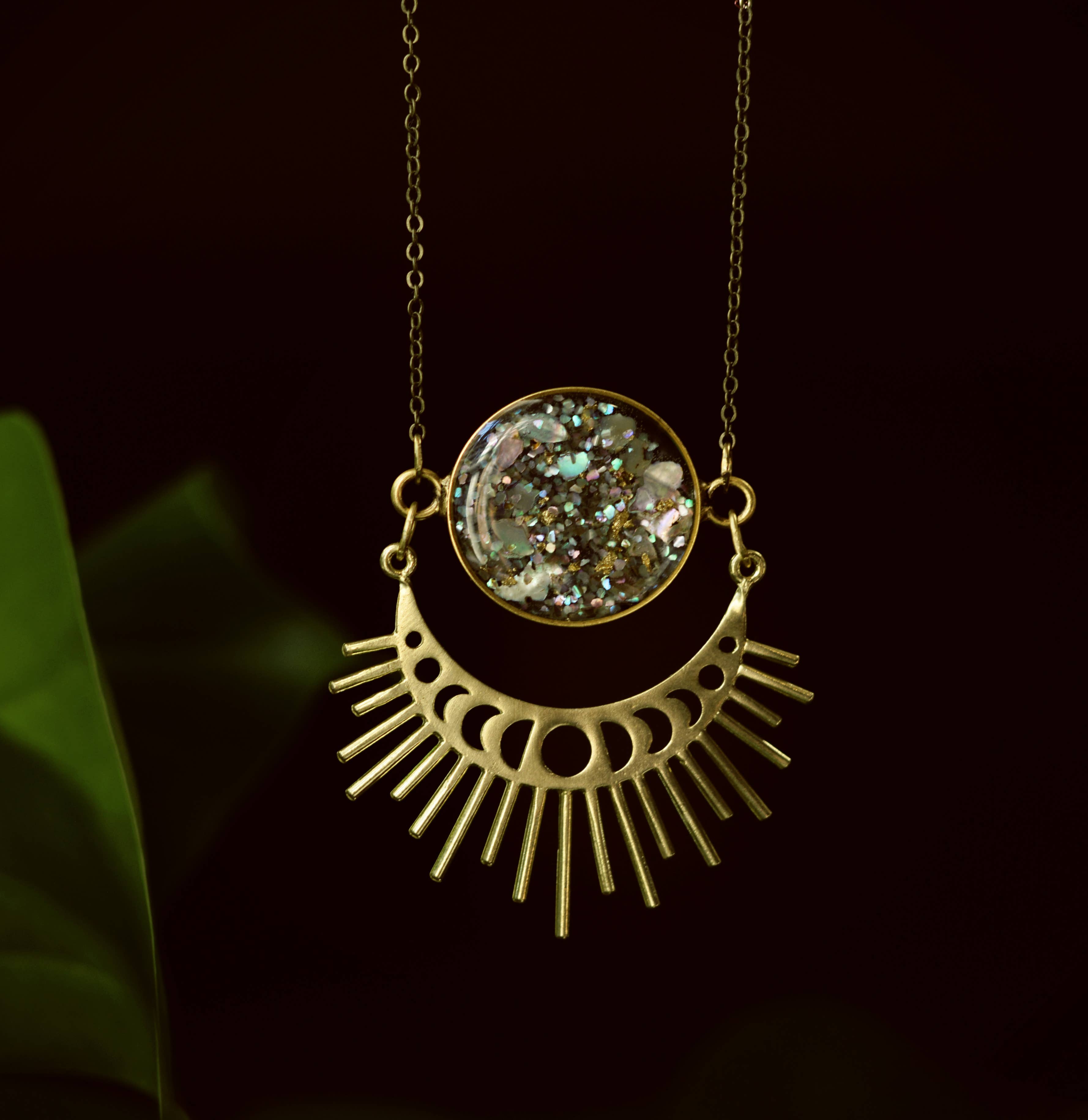Moonphase Starburst Statement Necklace features crushed gems combined with gold leaf flake suspended under layers of resin in an open 24kt gold plated bezel. Raw brass moonphase starburtst cut out pendant hangs underneath. Your choice of length in either antique bronze or gold plated with lobster clasp. Choose your own crushed stones. Shown here in abalone + gold leaf, 30" antique bronze chain.