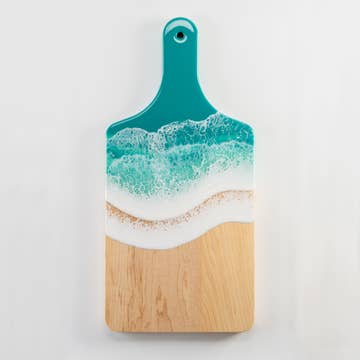 These gorgeous resin and wood serving boards are the perfect way to get the party started. Each board is one-of-a-kind. They make a great housewarming or wedding gift. Now you can have a picnic on the beach no matter where you are! * Approximately 17" x 8" * Maple or Walnut wood * Resin is non-toxic/food safe
