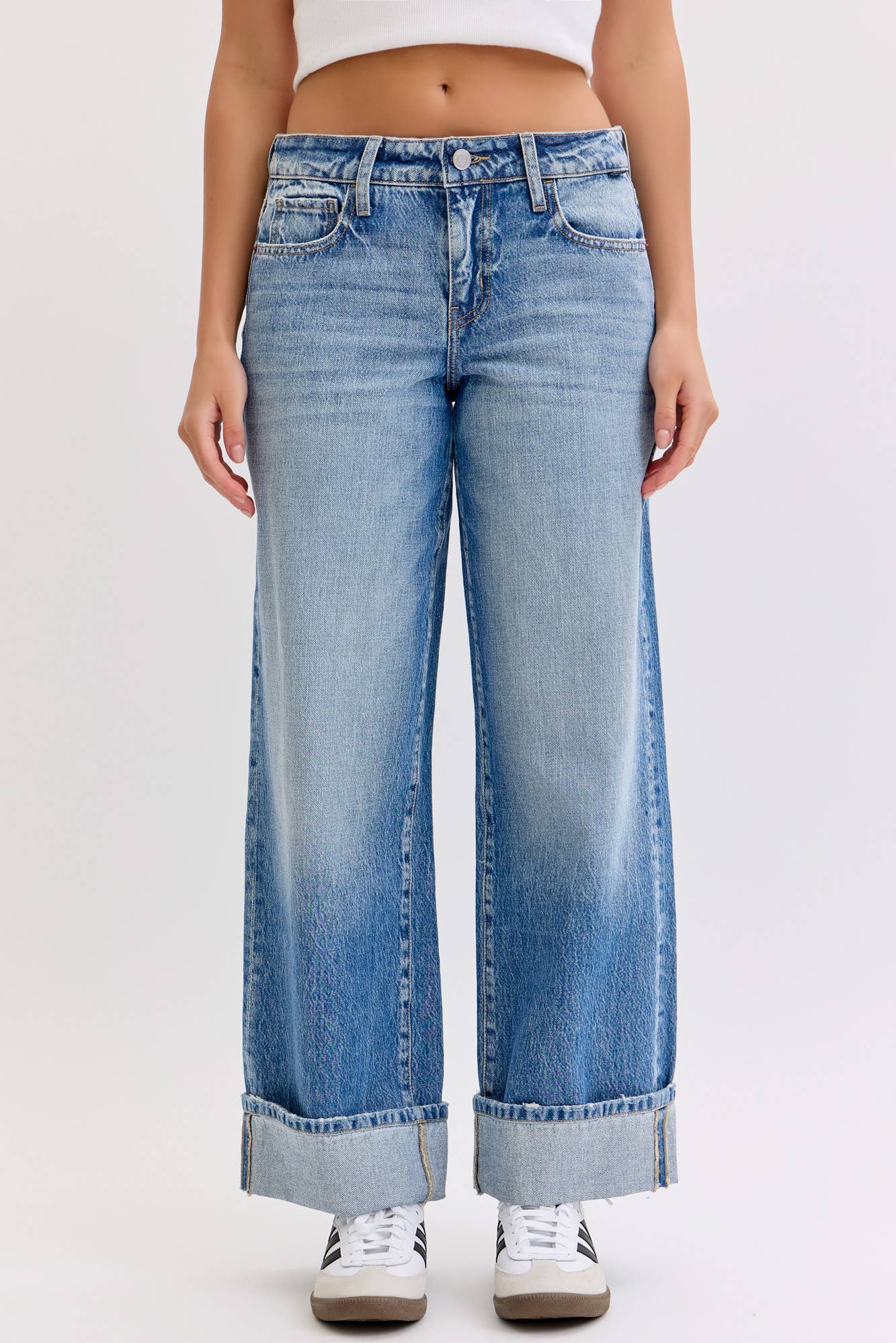 SKU: RJH-5985 Made in China Aesthetic: Casual and Streetwear Care Instructions: Machine wash Denim Wash: Light Wash Fabric: 75% COTTON, 25% POLYESTER Occasion Theme: Everyday Occasion: Everyday Pant Length: Ankle Pant Style: Wide Leg Pattern: Solid Rise Style: Regular Season: Fall/Winter Product Language: English