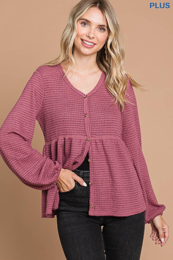 *Plus Size Style#CHT1821LX* -Button Down -Ruching Detail -Long Sleeve -Solid Top -Relaxed Fit -Oversize Waffle Hacci -64% Polyester 34% Rayon 2% Spandex -Imported. Designed in USA
