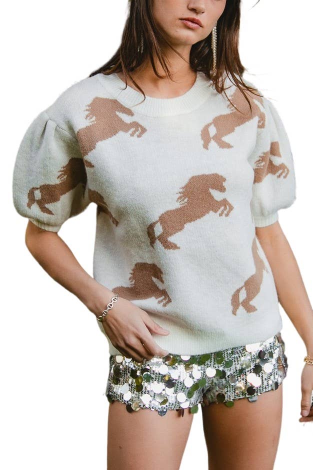 HORSE MOTIF PULLOVER SWEATER SELF:45%ACRYLIC,29%PBT,26%NYLON | IMPORTED MODEL IS 5'8" AND IS WEARING A SMALL
