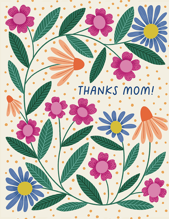 Bright, joyful, and full of heart. Featuring colorful type and playful florals, this card is a cheerful way to show appreciation for mom on Mother’s Day or any day that calls for extra gratitude. • A2 size (4.25" x 5.5") greeting card • Printed on FSC-certified recycled off-white paper • Sleeved in clear plastic with matching envelope • Blank inside for a personal message • Designed and printed in the USA