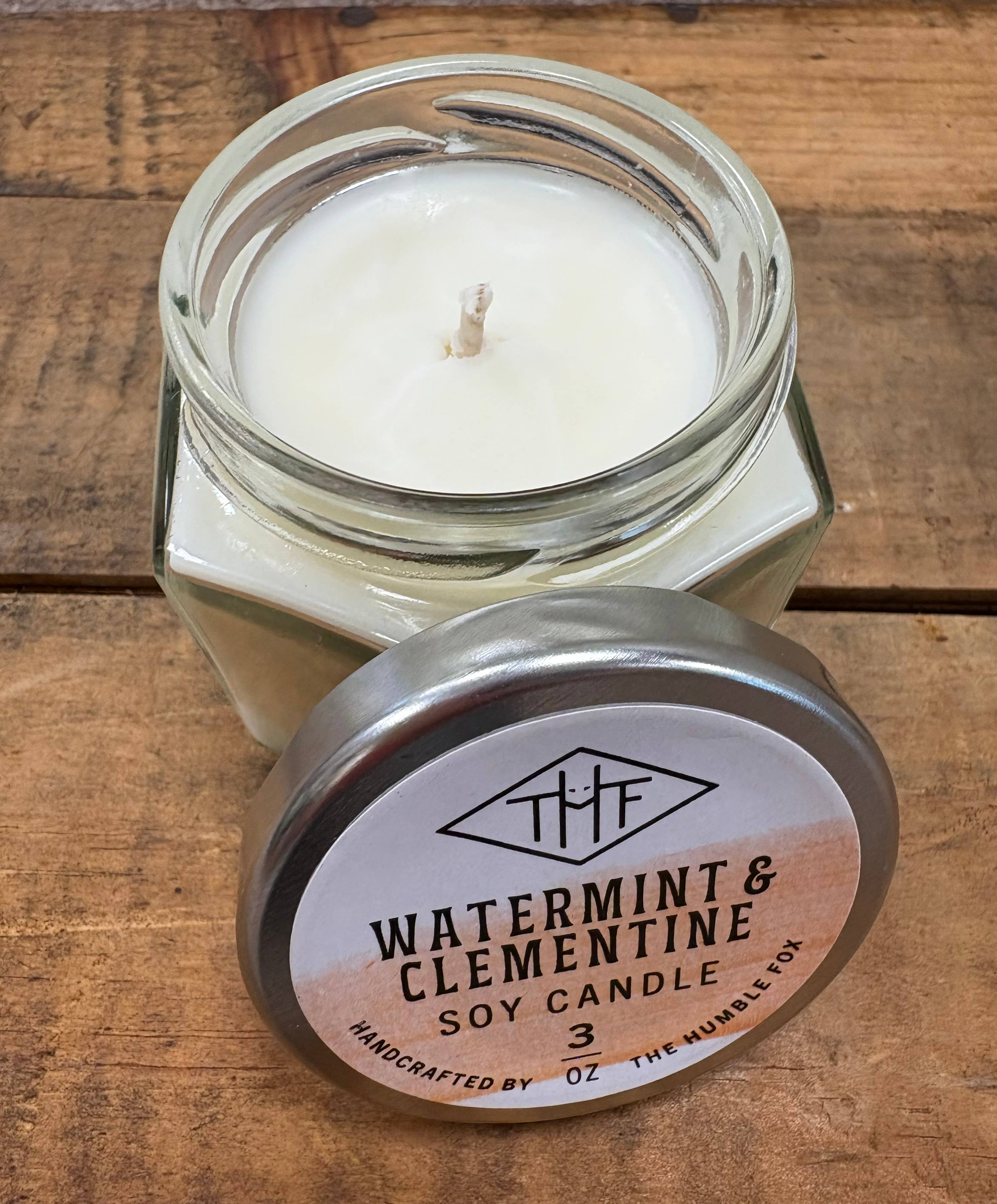 Made in United States Burn Time: 15-18 hours Flame Type: Flame Fragrance Family: Minty Material: Glass Size: 3 oz Wax Type: Soy Wick Material: Cotton Weight: 255.15 g (9 oz) Dimensions: 8.9 x 7.6 x 6.4 cm (3.5 x 3 x 2.5 in)