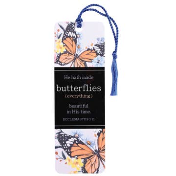 Discover the elegance of our handcrafted wood bookmark, featuring a stunning monarch butterfly design by artist Jenny Pope. Reflecting her artistic philosophy, this piece highlights the beauty and transformative possibilities of natural materials. The vibrant, fade-resistant design is UV-printed directly onto a solid maple wood center, bordered on both sides by intricately accented inlays crafted from domestic and exotic hardwoods. Each bookmark is unique, as the inlay combinations vary, showcasing exceptional craftsmanship. A gold colored tassel adds elegance and functionality.