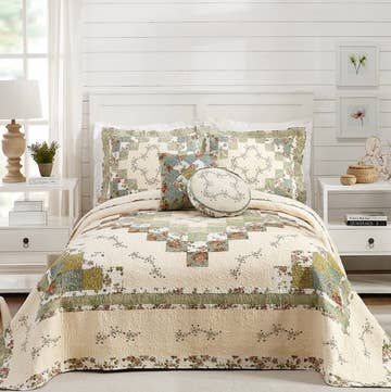Savor the sweet nostalgia of bygone days with Sweet Blooms Quilt. The heirloom texture of 100% cotton fabric gracefully presents an antique palette of ivory, honey, dusty coral, and hushed green that summons cherished family memories. The pieced quilt features a collection of painterly roses accented with burlap-inspired farmhouse stripes. Embroidered accents on the quilt and shams suggest lacework stitched by hand. Shams & quilt are sold separately. Full/Queen quilt: 90x90 King quilt: 108x90 Standard Sham: 20x26 100% cotton American classics inspired by the farm, with whimsical & personal touches from Mary Jane, the Mary Jane's Home brand was conceived by Mary Jane Butters on her organic farm in Idaho. It is an American classic, celebrating the rural aesthetic, along with a farmgirl ingenuity, beauty, humor and honesty. Like a neighborly cup of sugar, Mary Jane wants to sweeten your modern-day life with a style that is unmistakably farmgirl. quilt/bedding/floral/farmhouse/pink
