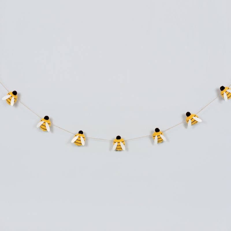The Sunflower & Bee Wooden Garland is a stylish seasonal strand of garland crafted with wood. The jute twine garland holds three wooden sunflower cutouts and two wooden bee cutouts. Each sunflower is accented by a small bee detail. Hanging loops at each end of the garland allow for easy display along a wall, window, or table edge. Garland measures 42" long. Each flower measures 5" in diameter, and each bee measures 2.5" high by 2.75" wide.