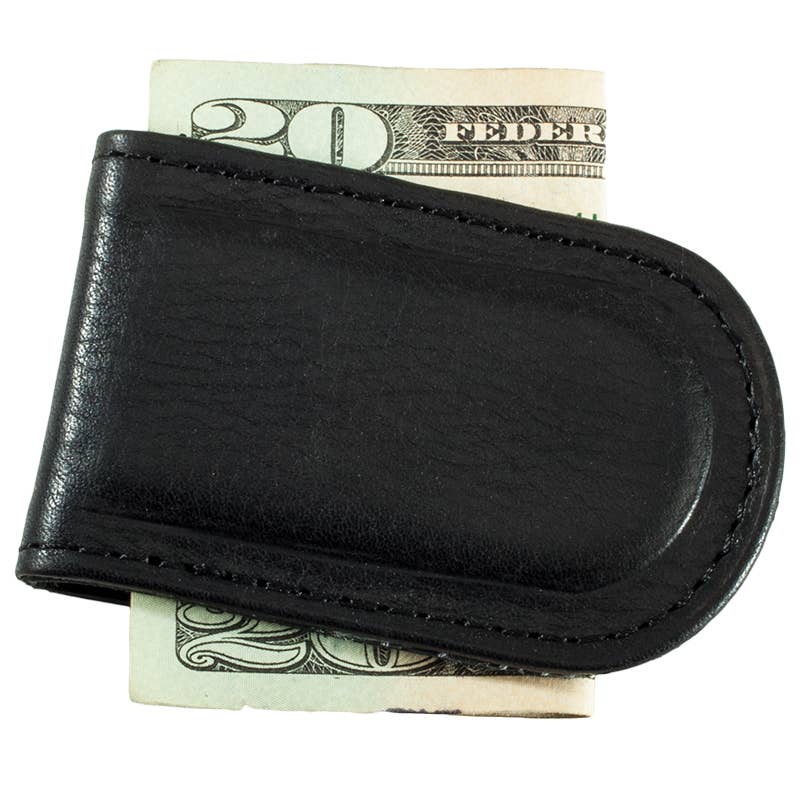 Black trifold chain wallet crafted from genuine leather and has a stencil of a flying bald eagle printed on the front. This wallet has double snaps securing the flap, two pockets, a card slot, a plastic photo insert, a detachable chain with a leather belt loop attachment, and a metal clip for extra security. Made in the USA. Material: Genuine leather - Measures 4 1/2" x 3 1/2" - 12" detachable chain - Handcrafted - USA Made