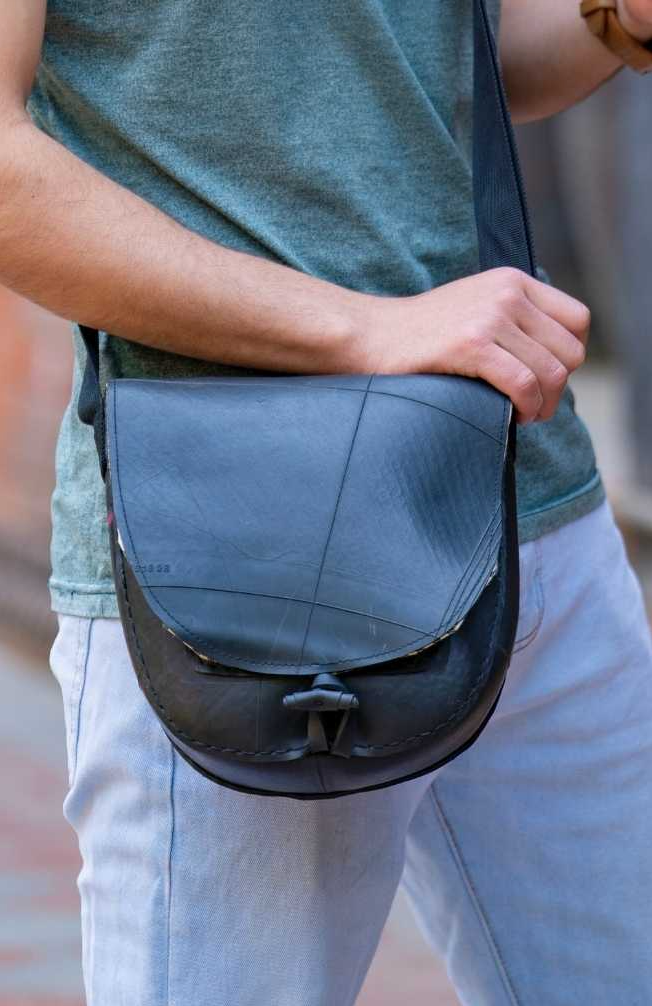 Small rubber flap bag with removable, adjustable strap that can be worn around the waist or on the shoulder. Measures 8″ wide x 6.5″ tall x 2″ deep with wonderful stitch detail, magnetic clasp, zipper top under flap, and striped cotton lining with credit card slots. Note: because these products are made from real used tires that have been recycled ( and not scraps of new rubber) they are each unique and may have imperfections. Please tell your customers not to leave these in the direct sun, they are black and they get hot!