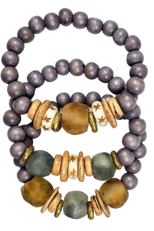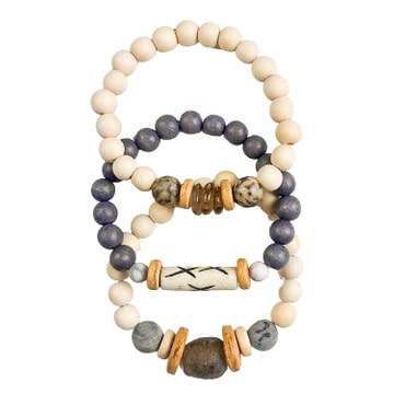 The Twine & Twig STONE Collection is designed with a combination of earthy elements to create a mixed neutral color scheme. These pieces are designed with gray, ivory and taupe stones that blend light + dark together and pair perfectly with winter sweater weather. The Twine and Twig Stacks are designed using globally sourced beads. Stacks come as a set of 3 stretch bracelets. Made with White Filipino Beads. Fits Wrist Size 7".