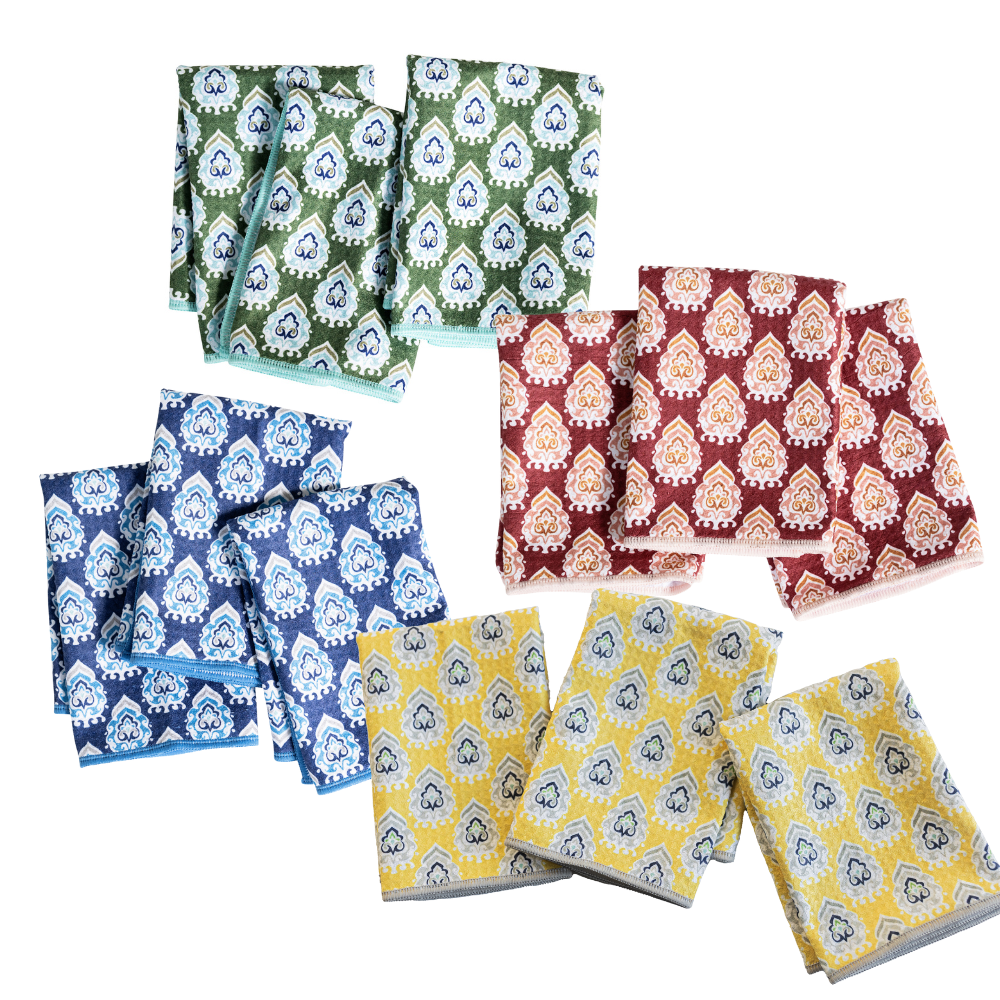In our attempt towards Zero Waste, these hand block printed 'Everyday Towels' are made from the extra fabric left over from our regular sized napkins. It's meant to be multipurpose. It's a fun mix of prints and colors - so it looks lovely on your kitchen counter. You may showcase it in a cute basket. You may use it for drying dishes, or cleaning a mess, or take it to a picnic or on your travels. It's also great for gifting paired with food or wine. We hope to do our part for the planet by minimizing waste. Use - Wash -Re-use. That's the motto of these towels! PRODUCT DETAILS: - block printed by hand using a carved wooden block - hand dyed in Natural Dyes - color - random mix - fabric - organic cotton - size - 7" x 11" - inches - set of 10 TIP: Wet the towel a little before picking up a spill - it helps to absorb the mess better. CARE: Machine wash separate, in cold delicate cycle. Lay flat to dry. Watch out for color bleeds in the first few washes.