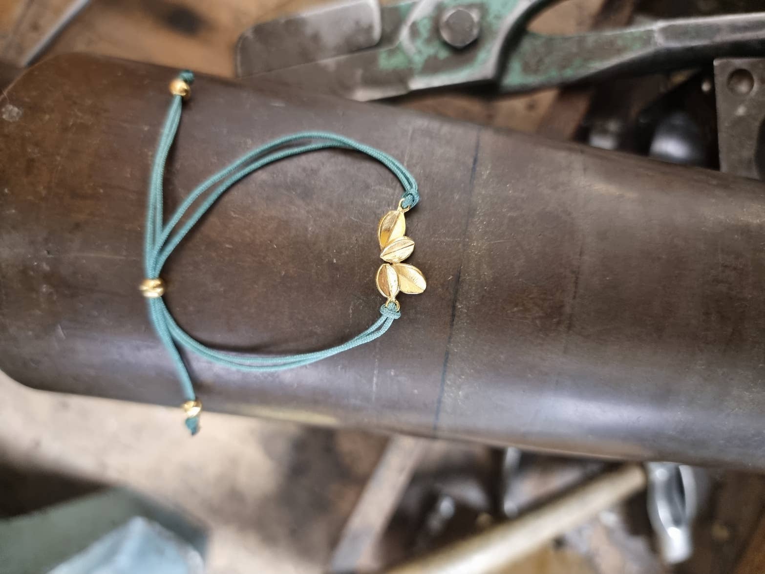 This bracelet comes with a black textile cord and a sliding ball that allows you to adjust the length you want.