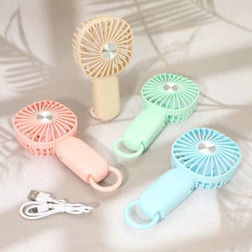 Cute handheld fan that is USB rechargeable. Great for kids and adults alike, is portable and useful for travel. Assorted colors. $2.75 per piece.