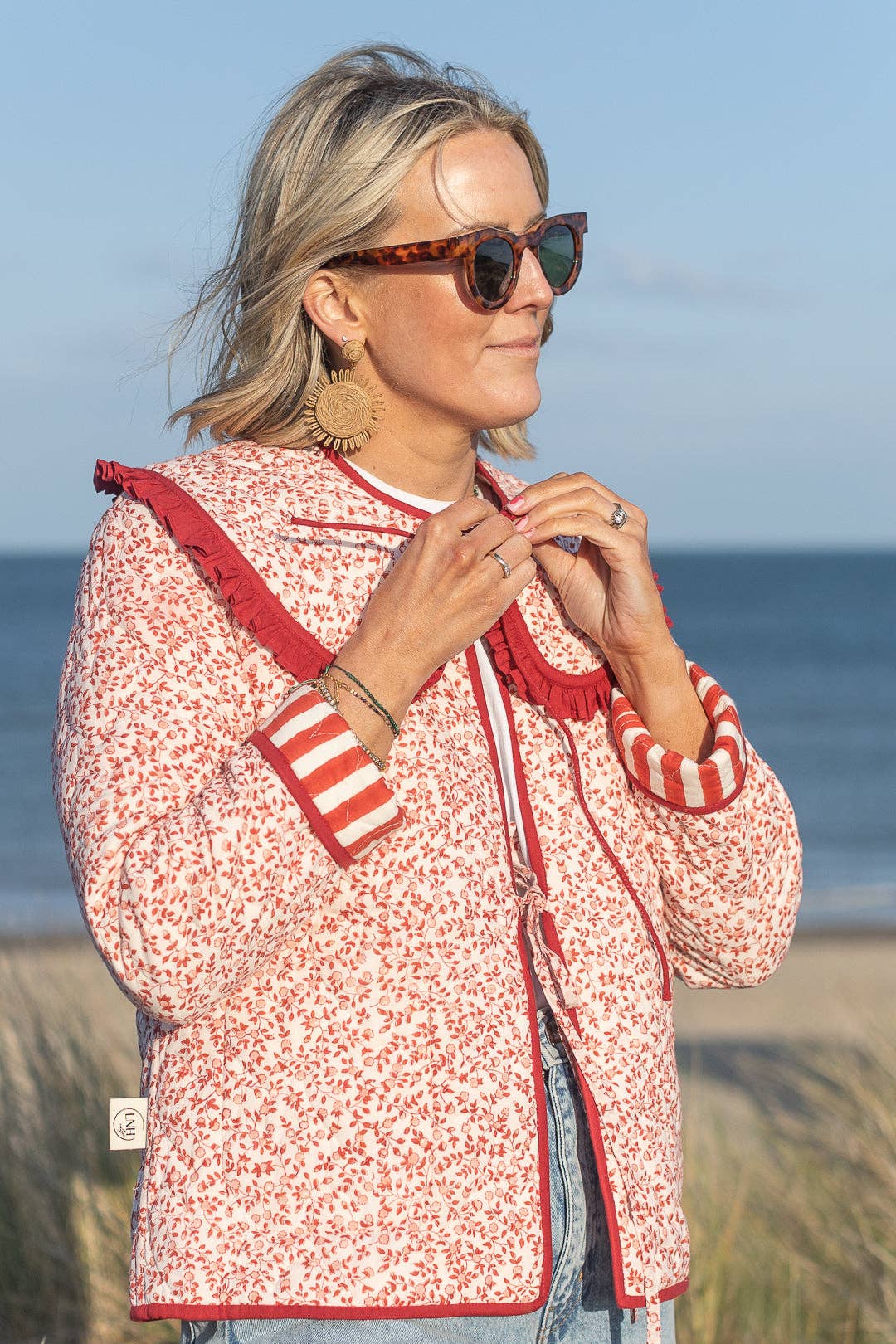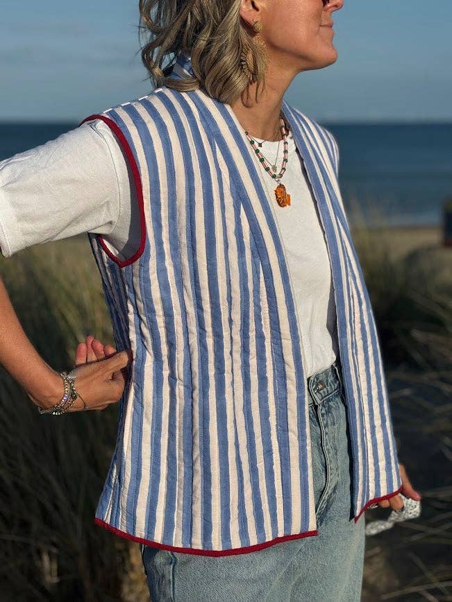 This New quilted Gilet showcases a lovely Red hand printed stripe and ditsy block print inside pattern . Made from the softest cotton, it features a belt and an open front for easy styling. Ideal with jeans and sneakers for a casual day or over a white tee to dress it up for summer. Crafted in India from 100% cotton It’s a fun and versatile wardrobe favorite! laura wearing Small