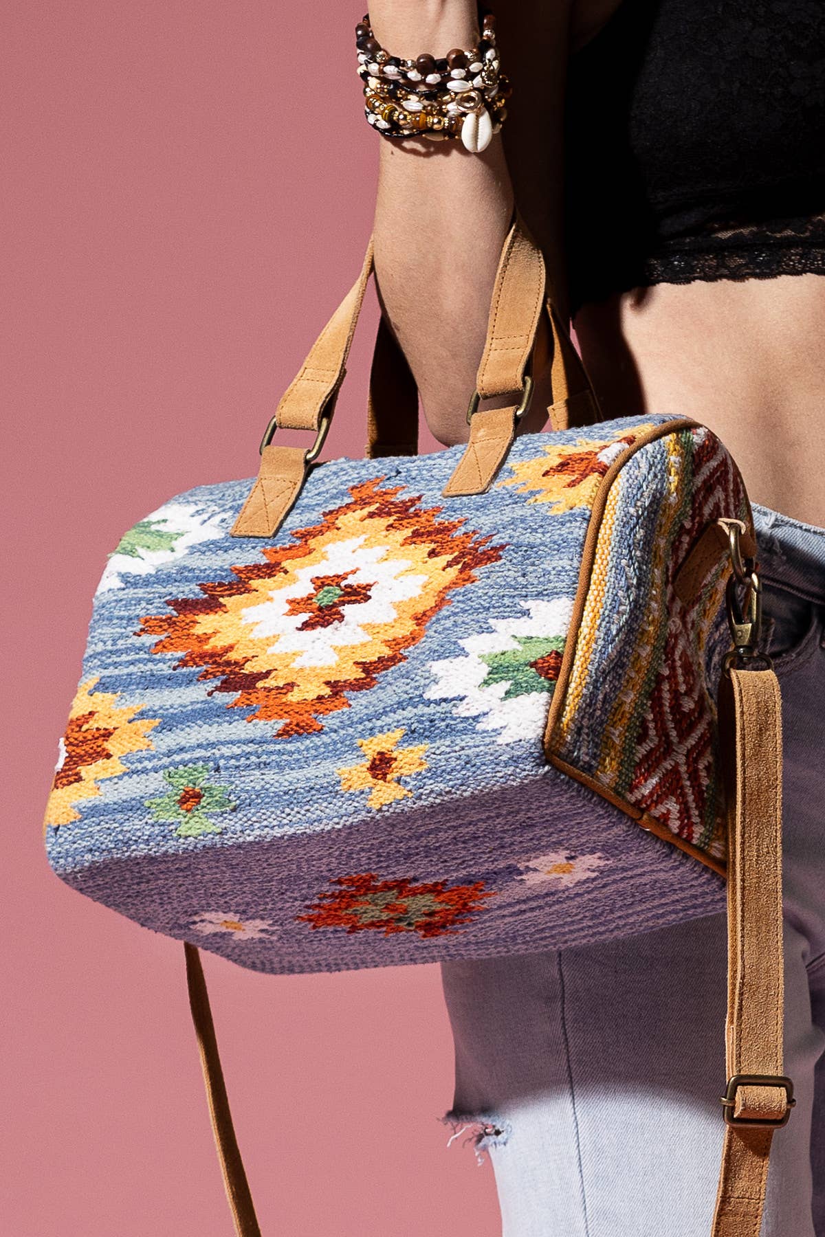 *Ruggine* Handmade ethnic Navajo washed denim color combo Boston bag with short straps and adjustable shoulder straps featuring inner pocket inside *Shell: 100% Cotton *Lining: 100% Polyester *Genuine suede handle/strap *APPROX. L 9" W 12.5" 2.0 lbs *Made in India