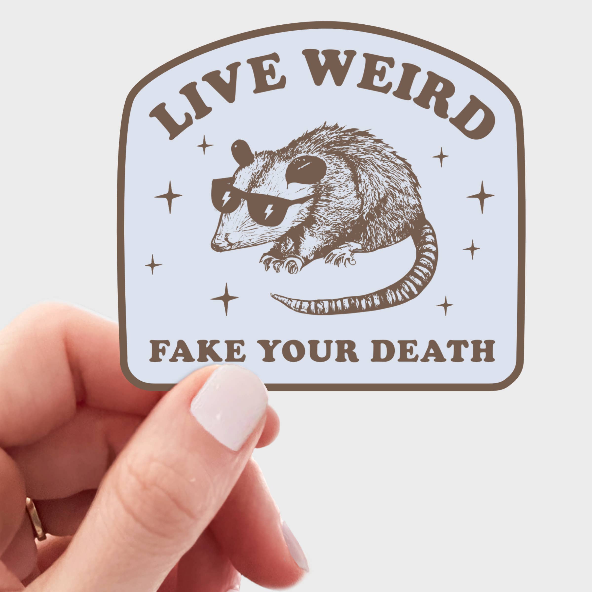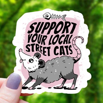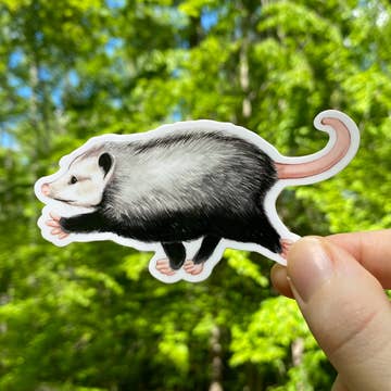 The Design: Hand drawn opossum on a bicycle. Material: Durable printed vinyl Size: 4.28" x 6"