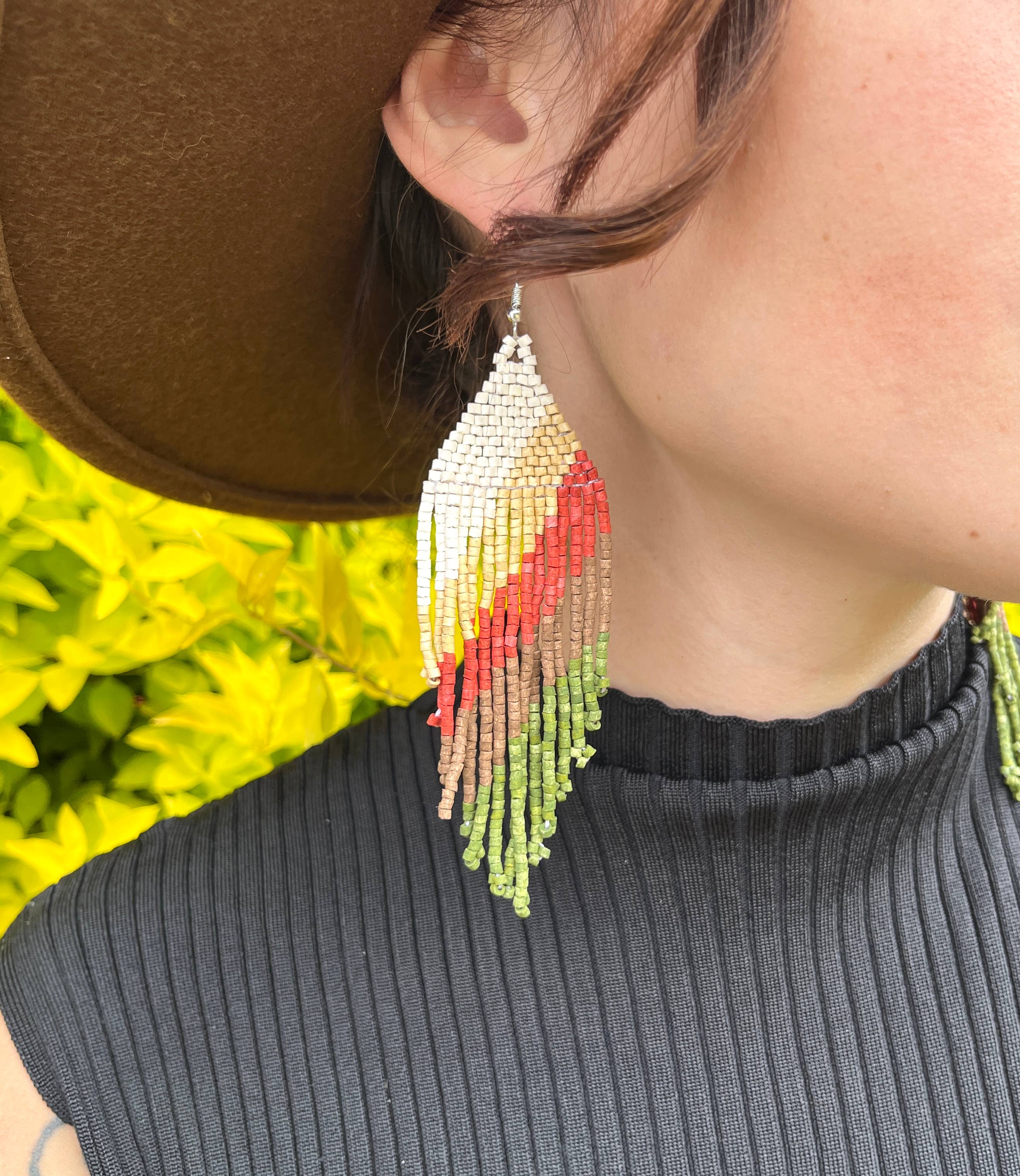 Ethically handmade by Mayan artisans in Guatemala. Each clay bead is handmade using a pre-Columbian technique from the indigenous people of Colombia. Our Colombian family brought it with us to Guatemala to work with talented Mayan artisans. This one has our smaller bead which is more intricate to work with and also takes longer to create. This style is drop-shaped with a synergy of colors in a geometrical, mirrored pattern. Each pair comes with an earring card with care instructions. See images for example. 100% handmade by Mayan artisans in Guatemala. Material Beads: Ceramic Beads™, dyed w. acryllics Hook: Hypoallergenic hook Weight: 6g // 0.21oz All our jewelry is 100% handmade and hand-dyed. Colors or shapes may vary slightly.