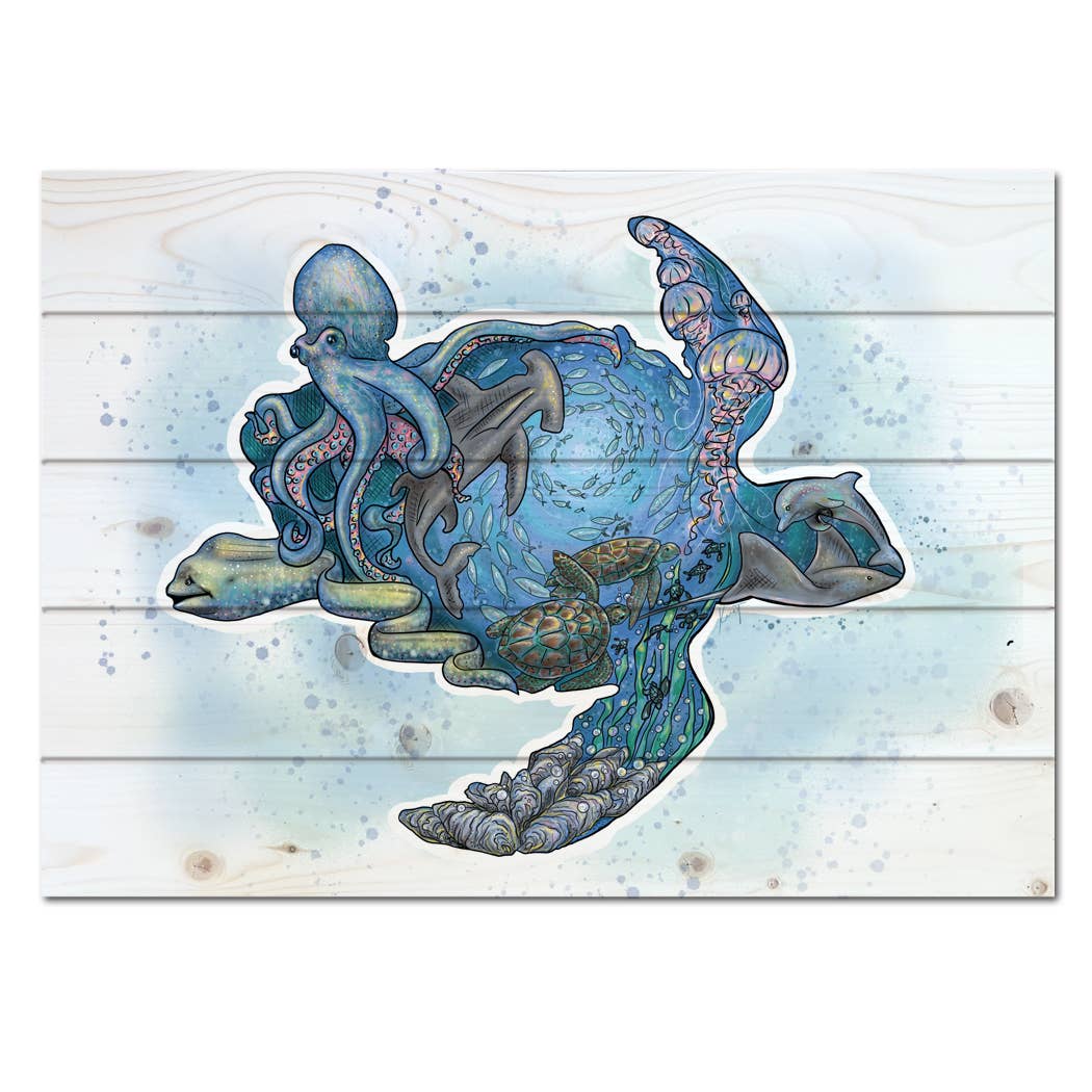 A hand-painted turtle gracefully set against a white shabby plank wood, its weathered textures adding rustic charm to the backdrop. The turtle comes alive with intricate brushstrokes and a radiant color palette—emerald greens, deep teals, warm golds, and earthy browns. Its shell displays a natural mosaic, blending shades that mimic ocean hues, while the lifelike details of its limbs enhance its elegance. A layer of clear sea glass overlays the painting, creating a stunning 3D effect. This translucent glass magnifies the turtle’s vibrant colors and adds depth, as light reflects off its uneven edges. The arrangement of the sea glass feels organic and coastal, complementing the rustic wood while bringing a modern, luminous pop of color to the piece.