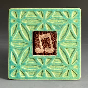 This coaster features jazz saxophonist John Coltrane. Multi-functional little art pieces make great gifts, and are a great size (and price) for buyers. * Transparent charcoal blue glass, printed in silver mica * 4" square, with rubber bumpons on bottom * Dishwasher safe * Handmade in the USA Coasters are screen printed, fused glass. Glass is cut, and screen printed by hand with fine glass enamels, then fused overnight to 1415 degrees in a kiln. Each piece is made by artist Laurie Freivogel in her Oak Park studio.