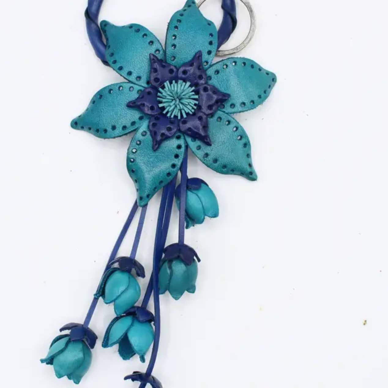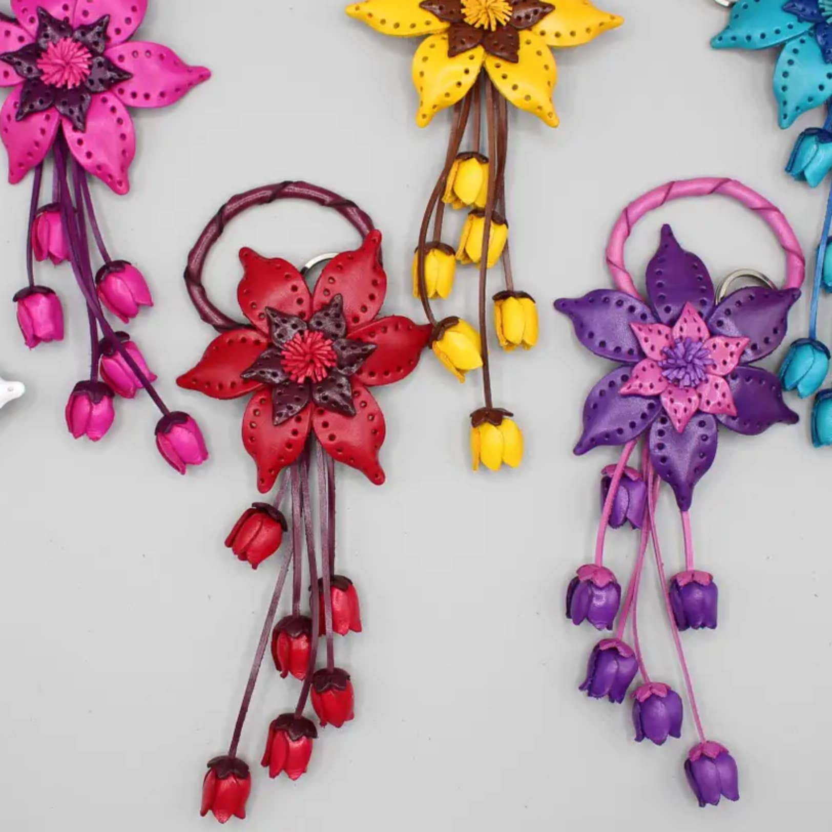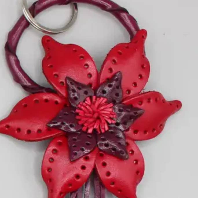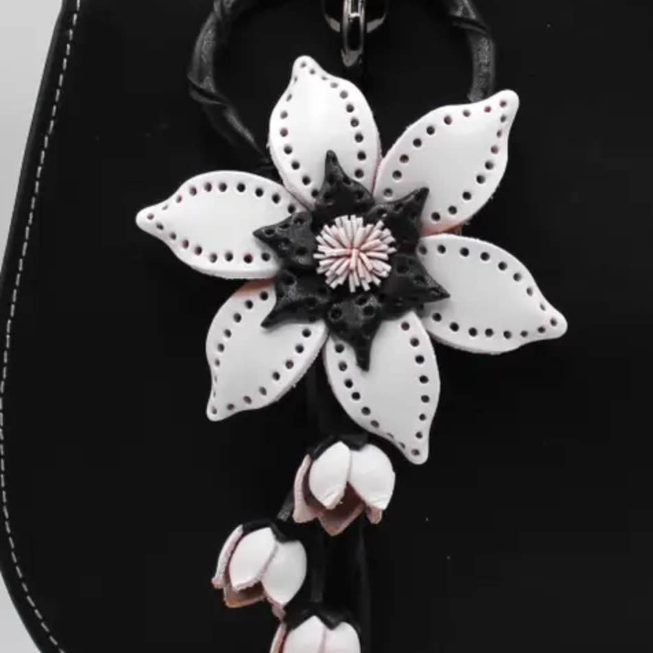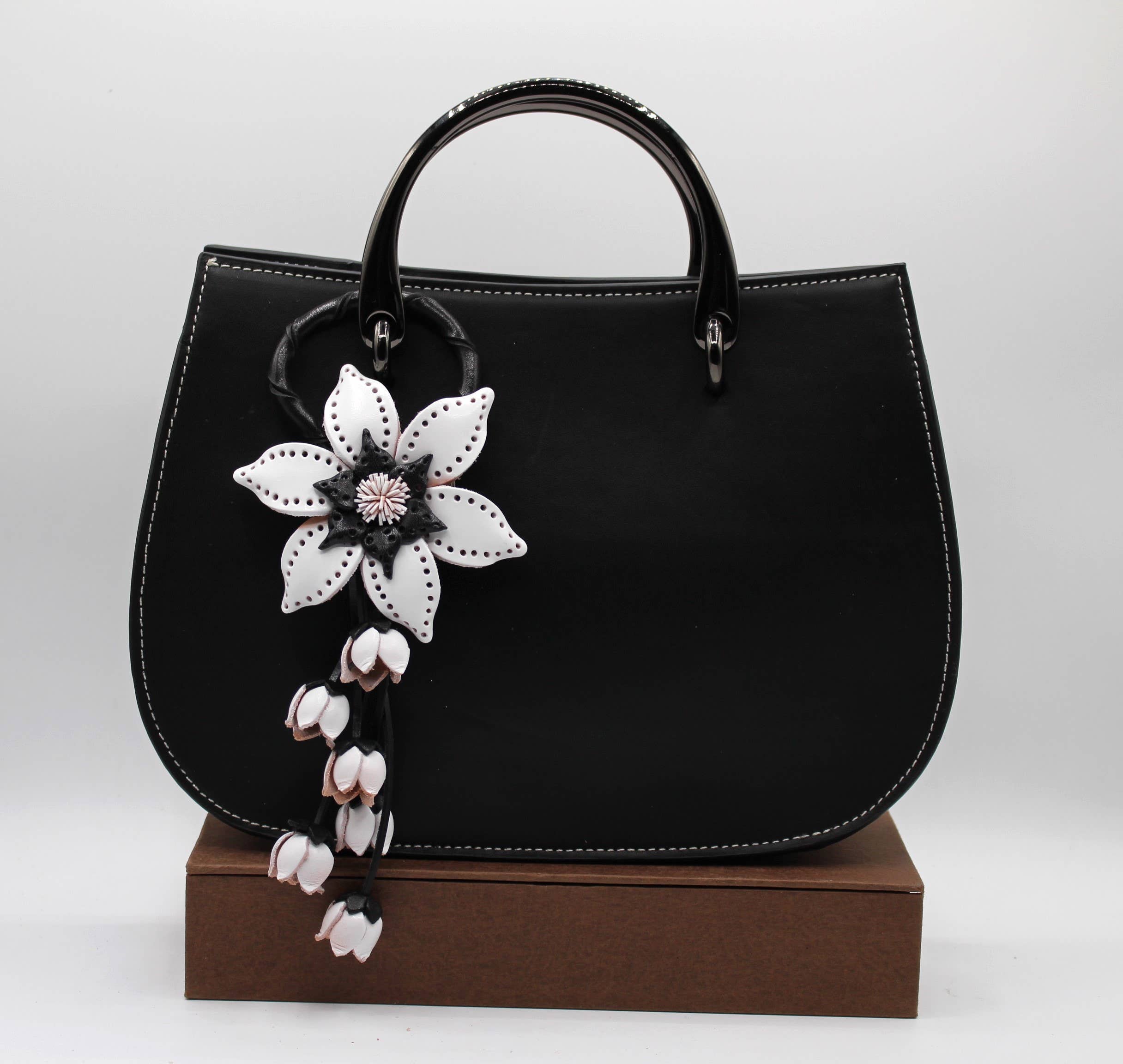 Handmade from genuine leather Available in any color including red, pink, yellow, green, orange, pink, blue and white. The snaps on the back of the flower can be hung on your purse, making your purset look more elegant and high-end. Flower Size: Approximately 2.75 inches to 3 inches Length from top to bottom: approximately 7.5-8.5 inches