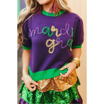 - Ribbed crew neckline - Casual drop shoulder - Long-sleeve ribbed hem - Colorful Color block detail - Pullover style - Soft touch - Cozy and fun, this sweater brings playful glamour to your wardrobe while keeping you comfortable for all the festivities ahead - Holiday, Dat Party, Winter, Outdoor, Daily, Going out * Styled with VP83031 * Mardi Gras Item * Model is 5'8, 32-27-37, wearing SMALL