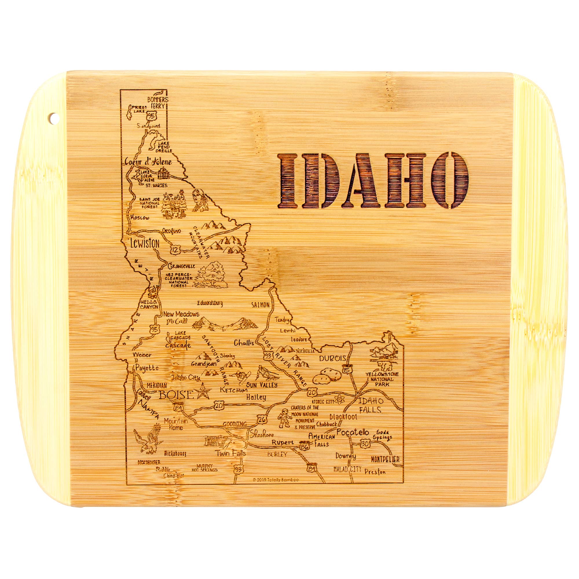 Celebrate Idaho with this beautifully crafted bamboo cutting board! Shaped like The Gem State, it features laser-engraved artwork highlighting the iconic towns, landmarks, and sights that define Idaho. Shoppers love using it as a fun, conversation-starting charcuterie board for serving crackers, cheese, meat, fruit, candy, and other favorite snacks. The blank reverse side offers all the benefits of a bamboo cutting board: a durable, lightweight, and knife-friendly cutting surface. Cut on the back and serve on the front to minimize clean up! When not in use, the included hang tie easily transforms the cheese board into eye-catching home decor. Part of Totally Bamboo's top-selling Destination Series, which includes every state, this Idaho-shaped cutting board is a must-have for gift shops, kitchen stores, and boutiques. It's a go-to gift purchase for Christmas, Mother's Day, graduations, housewarmings, weddings, and more! Destination Idaho cutting board measures 15" x 10-1/2" x 5/8".