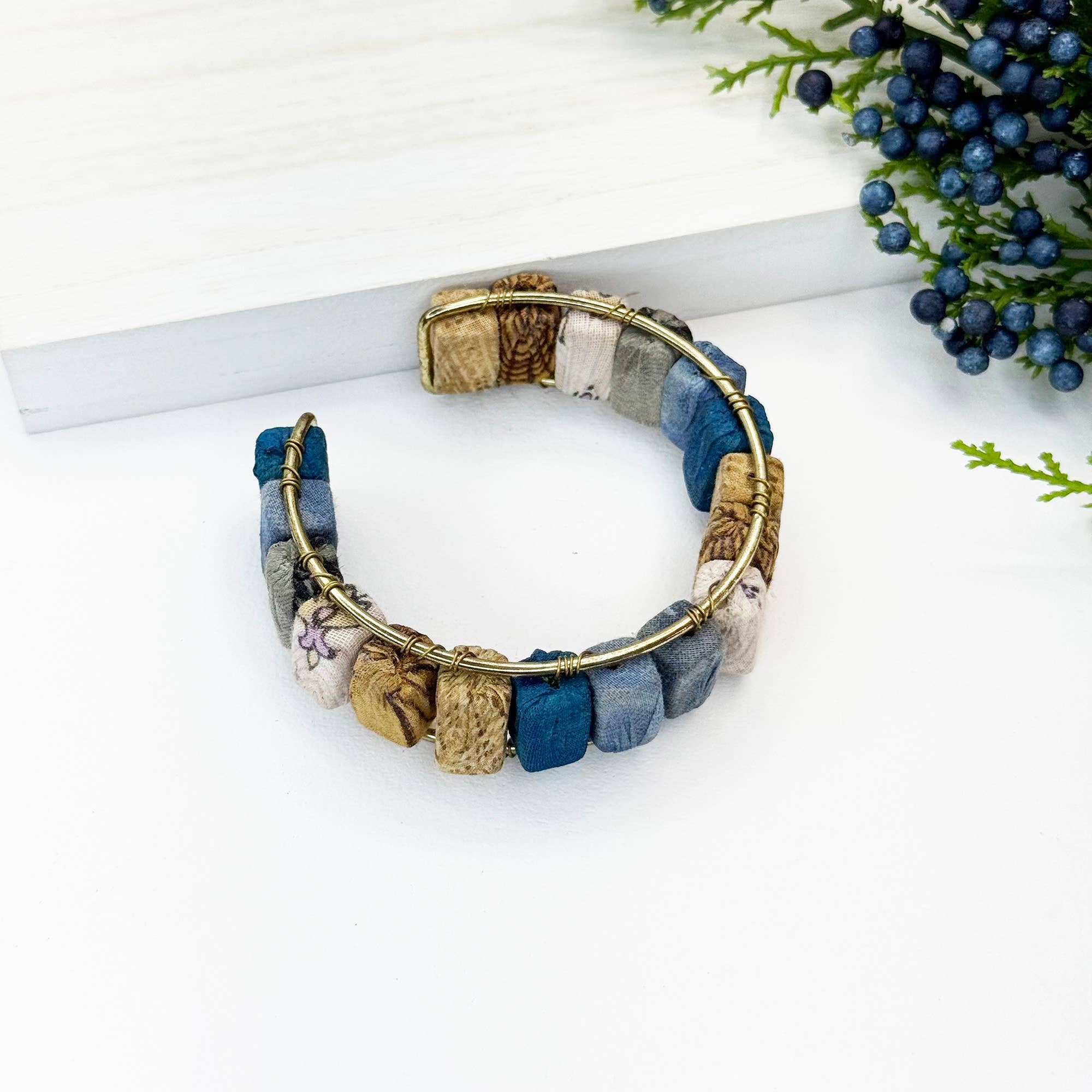 Tiny recycled Kantha textile beads are suspended within a frame of gold metallic beads to create a mesmerizing wall of color. Made up of flexible wires at its base, the bracelet bends to accommodate wrists of all sizes. • Measures 2.25" wide and approx. 7.5" in circumference. • Colors & patterns will vary due to repurposed textiles. • Sustainably handmade by women artisans in India.