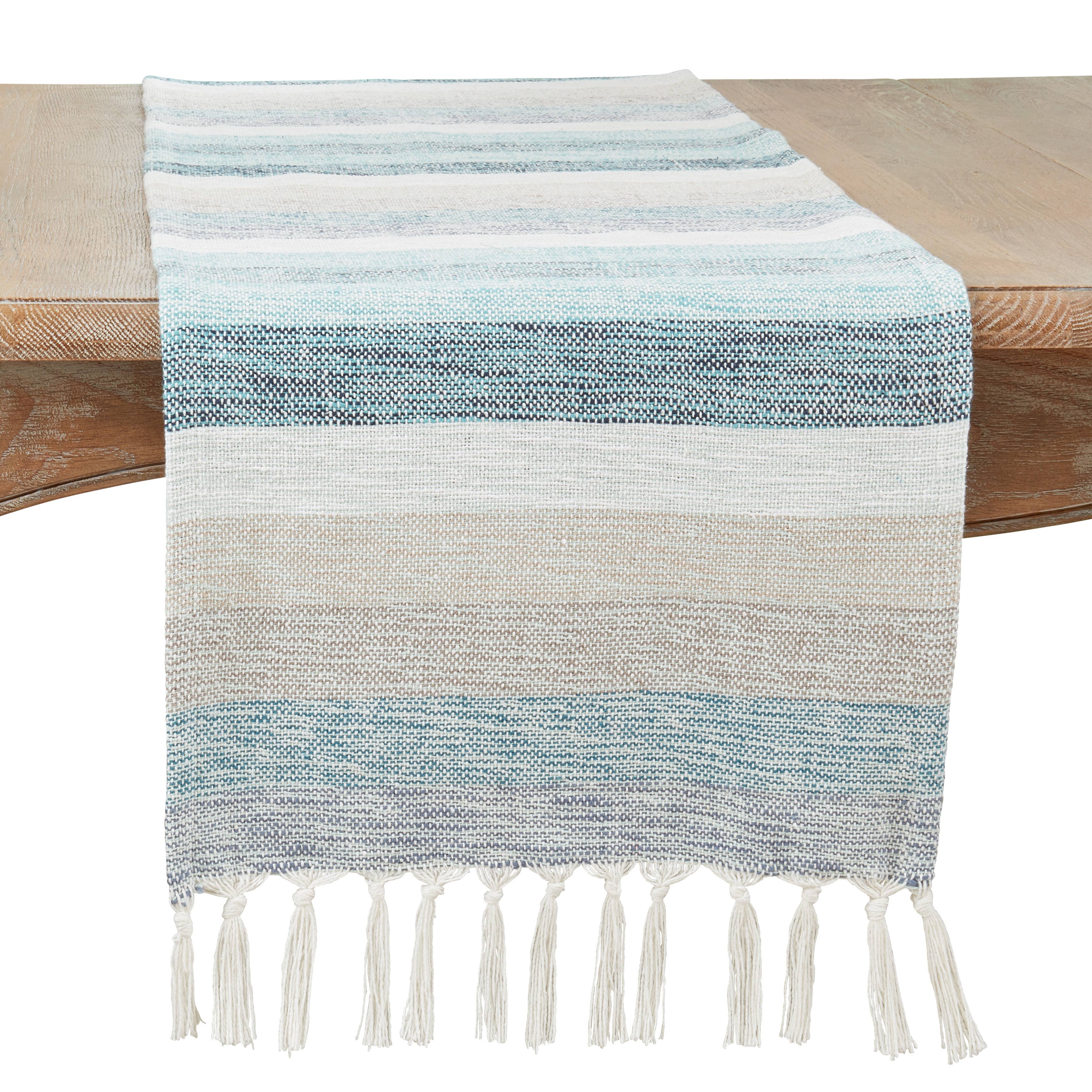 Rustic Blue Stripes Fringed Linen Table Runner 14" wide