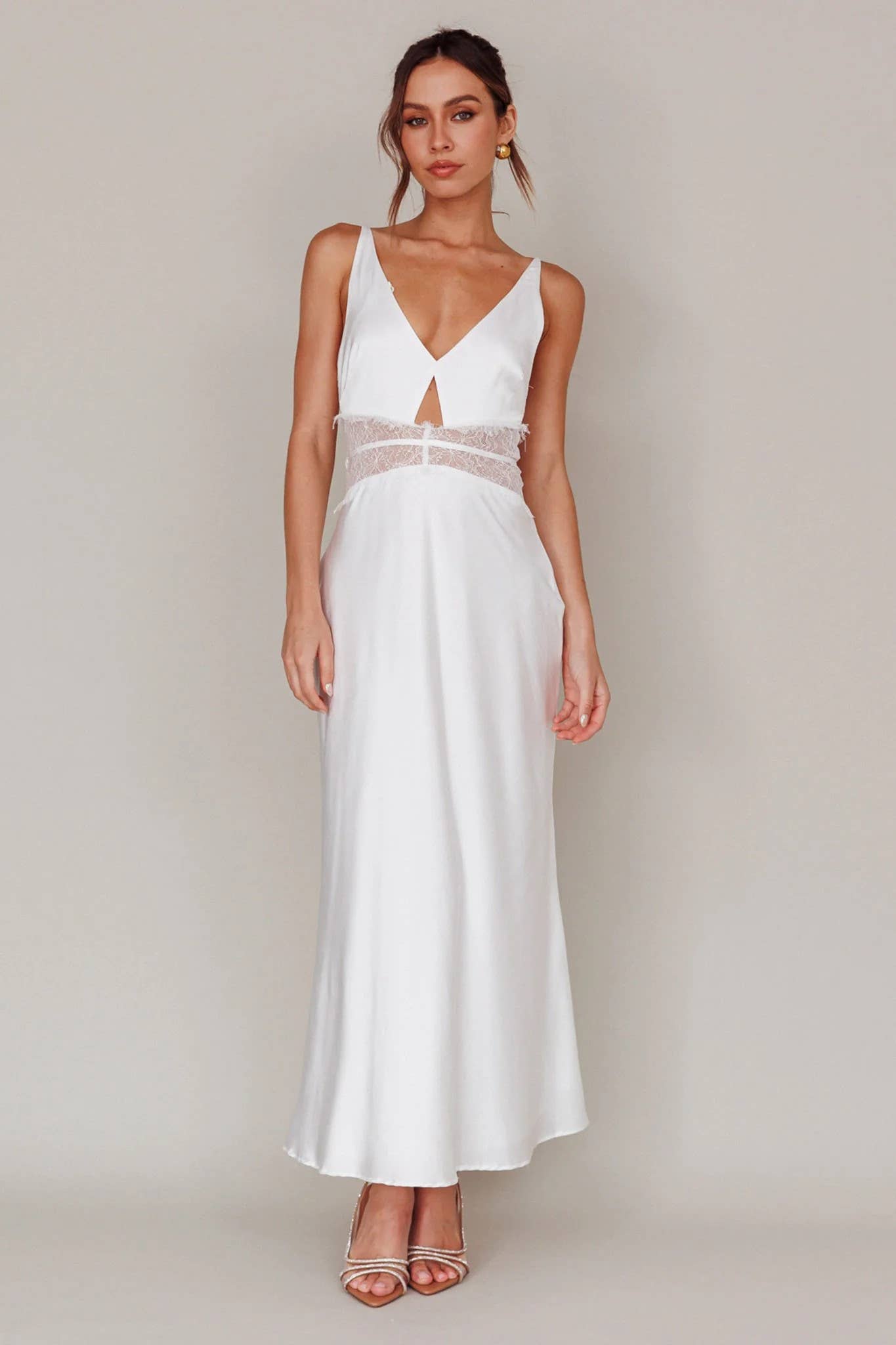 Material:Polyester,Lace,Lace,5%Spandex,70% Polyester Style:A-line,A-line,Sleeveless,Sleeveless Feature:Tiered,Split-side Occasion:Evening,Evening,Wedding,Wedding Seasons:Spring,Spring,Summer,Summer Type:Maxi Dresses,Maxi Dresses Neckline:Deep V-Neck,Deep V-Neck Size S (inch) : Bust= 33.54 ; Waist= 26.52 ; Length= 53.82 ; Size M (inch) : Bust= 35.10 ; Waist= 28.08 ; Length= 54.21 ; Size L (inch) : Bust= 36.66 ; Waist= 29.64 ; Length= 54.60 ; Size XL (inch) : Bust= 38.22 ; Waist= 31.20 ; Length= 54.99 ;
