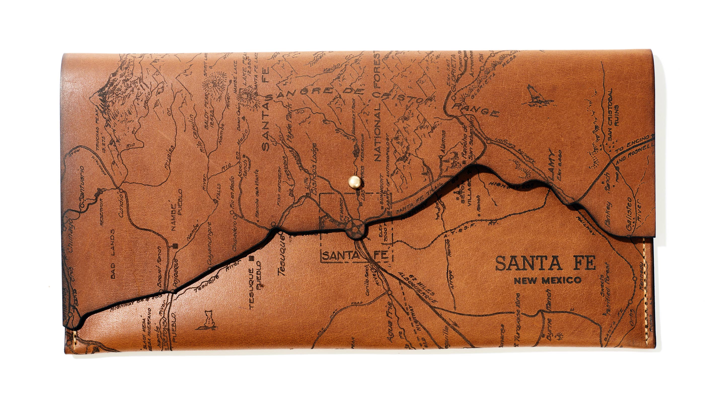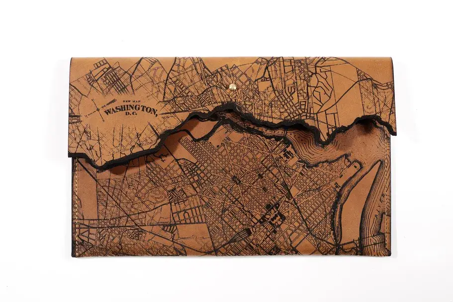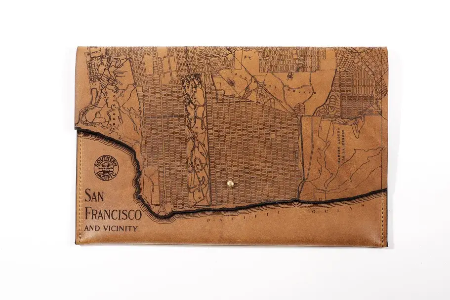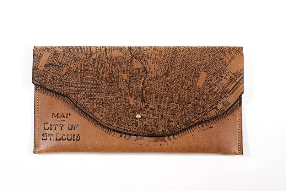Our Clutches are made in Milwaukee, Wisconsin of locally tanned full-grain leather from Seidel Tanning Co. After laser etching an 1880 map of the city onto the leather, we machine stitch the clutches with bounded nylon thread and add a solid brass screw stud closure. All edges are beveled by hand with pure beeswax to a gloss finish. This clutch measures 6" x 12”.