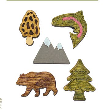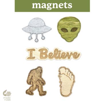 Washington Magnets Set This souvenir is the perfect gift for tourists and locals alike! Adorn your fridge with inspiration for your next adventure! - State Shape - Bigfoot or Apple - Heart - Mountain - Pine Tree Each set comes with five magnets made of 1/8" hand-stained wood sealed for durability with a child-safe ceramic magnet on the back. The magnets are approx 1/4 inch thick and 1 3/4 inches square. Each Magnet set is packaged in a crystal clear bag with a sturdy backer board, and reinforced hang strip on top for easy retail display. Made in Oregon