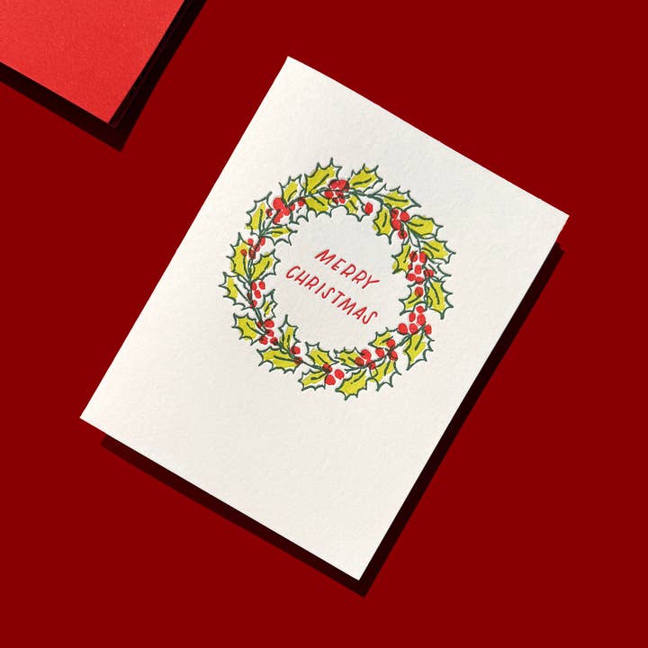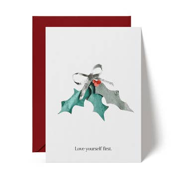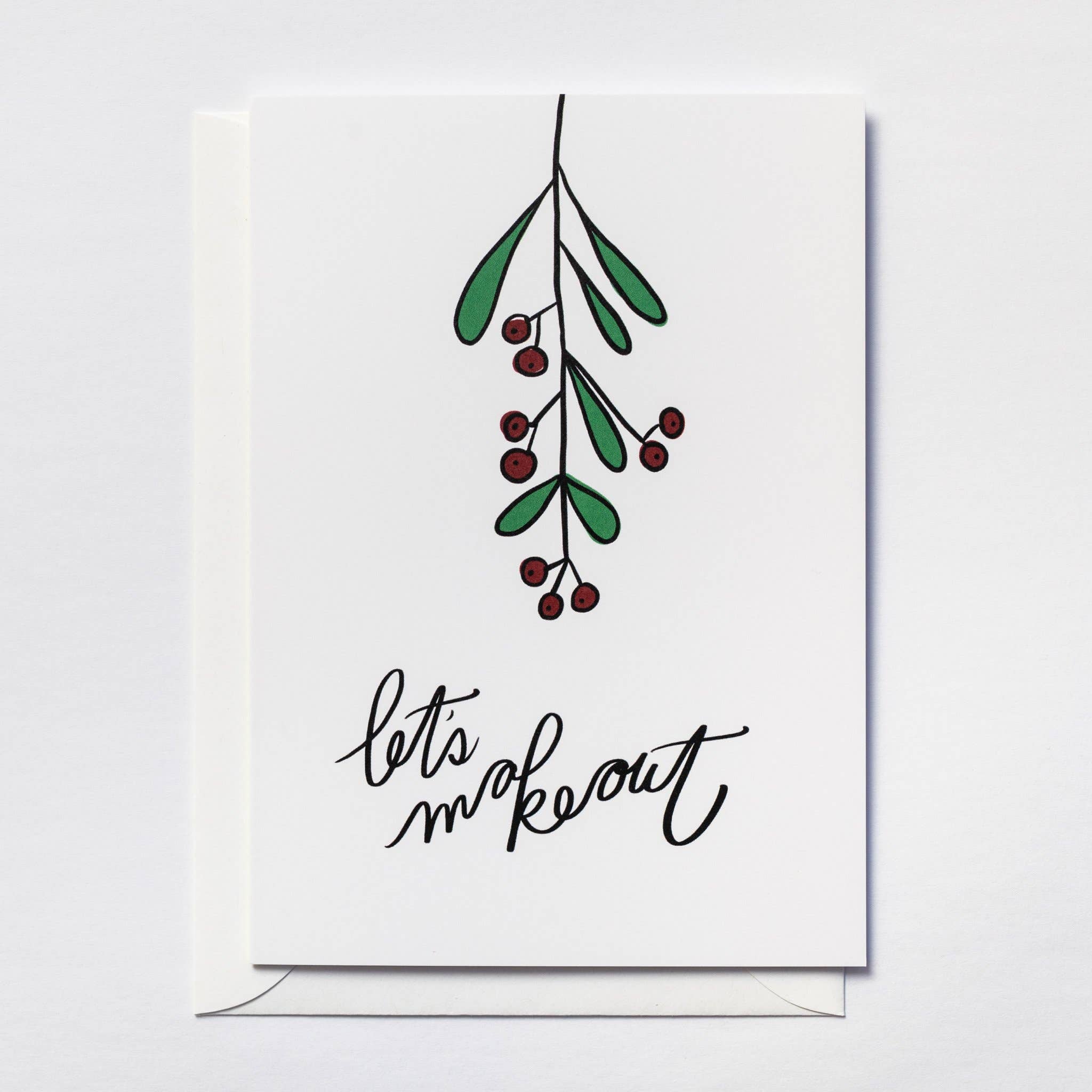 A sprig of mistletoe descending from the top of the card and "You Me Mistletoe" in hand-lettered text create the kind of flirty, romantic energy that makes customers smile and immediately think of their person. This is the winter season greeting card that sells itself because the sentiment does exactly what the customer walked in wanting to say, and the mistletoe illustration makes it impossible to scroll past on a holiday wall full of trees and snowflakes. Most holiday card displays lean heavily into family, friends, and general well-wishes. This one fills the gap for customers shopping specifically for a spouse, partner, or someone they're falling for right now. That romantic niche is underserved on most card walls, which is exactly why it gets picked up the moment someone spots it. - Mistletoe illustration reads as playful and inviting rather than overly sentimental, appealing to customers who want romance without the Hallmark-movie earnestness that makes some shoppers put a card back - Works for new couples and decades-long marriages alike because the sentiment is flirty without being exclusive to any stage of a relationship - Stands out face-out among typography-heavy and family-focused holiday cards, giving your seasonal display the romantic variety that catches eyes and fills a category gap - Vintage christmas aesthetic with hand-drawn botanical detail appeals to customers drawn to classic, timeless design over trendy minimalism - Pairs naturally with couples gifts, candles, wine accessories, and date-night displays where the add-a-card impulse peaks during December shopping - Letterpress printed on cotton paper with tactile impression - Blank inside for a personal message, includes signature envelope Merchandise this face-out in your holiday section starting in late November, positioned near romantic or couples-oriented gifts where customers are already thinking about the person they love most. The mistletoe illustration catches attention from across the store because it signals something different from the standard season cards surrounding it. This is the card for customers who want their holiday greeting to land like a kiss under the mistletoe. That warmth is what moves it off the shelf.