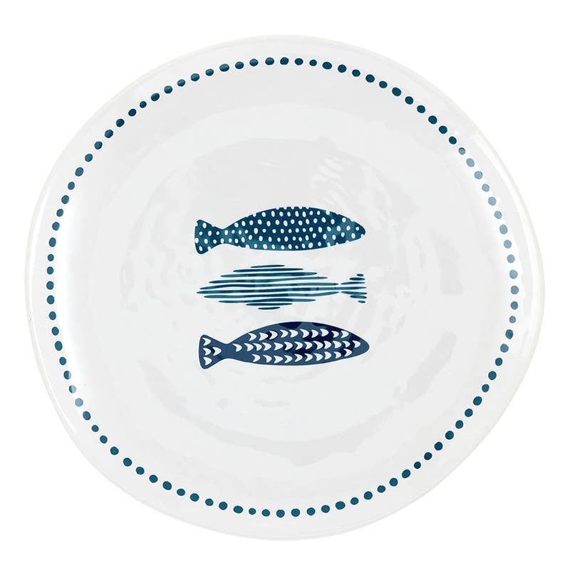 The set of 2 plates are 8" round and .5" tall and are made from glass. The tops are glossy, and the bottoms are matte. Serve all sorts of appetizers on these nautical-themed plates. The one plate has a white background with a large anchor; the quarter of the left side of the plate has a blue background with fishing bobs. The second plate has a blue background with lighter blue waves and red polka dots. Dishwasher safe. Handwashing is recommended to preserve decals. Packaged in a printed-patterned box that cheerfully displays the pattern on the duble kitchenware. Wonderful for a waterfront, seaside boat, lake, or beach-themed kitchen. This summertime feel will bring a bright pop of color to the home. Lake, Beach, or Boat lovers will be thrilled to add this unique piece to their collection.