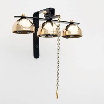 #2 size bell (medium tone), with 3 bells on strap. Overall length: 10 inches Solid brass bells attached to heavy duty leather, attached with a 2 1/2” ring to easily fit over any standard sized door knob. Choose from the leather colors: Black, Dark Brown, Light Brown, Burgundy or red Brass or Nickel Plated Bells. NOTE: Nickel Plated Bells are $1.00 extra per bell.