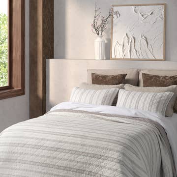Crafted from a 100% cotton shell with a light poly fiber fill, this quilt set is lightweight, soft, and made to last. The minimalist channel stitching is just enough detail to comfortably fit in anywhere. Set includes matching pillow shams. Details * 100% Cotton Shell, Polyester Filling * Machine Wash and Dry on Low * OEKO-TEX Standard 100 Certified * Includes Matching Pillow Shams (Twin has 1 Sham) * Twin 68" x 90", Full/Queen 90" x 90", King 90" x 108"