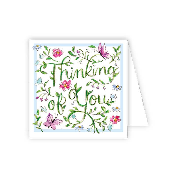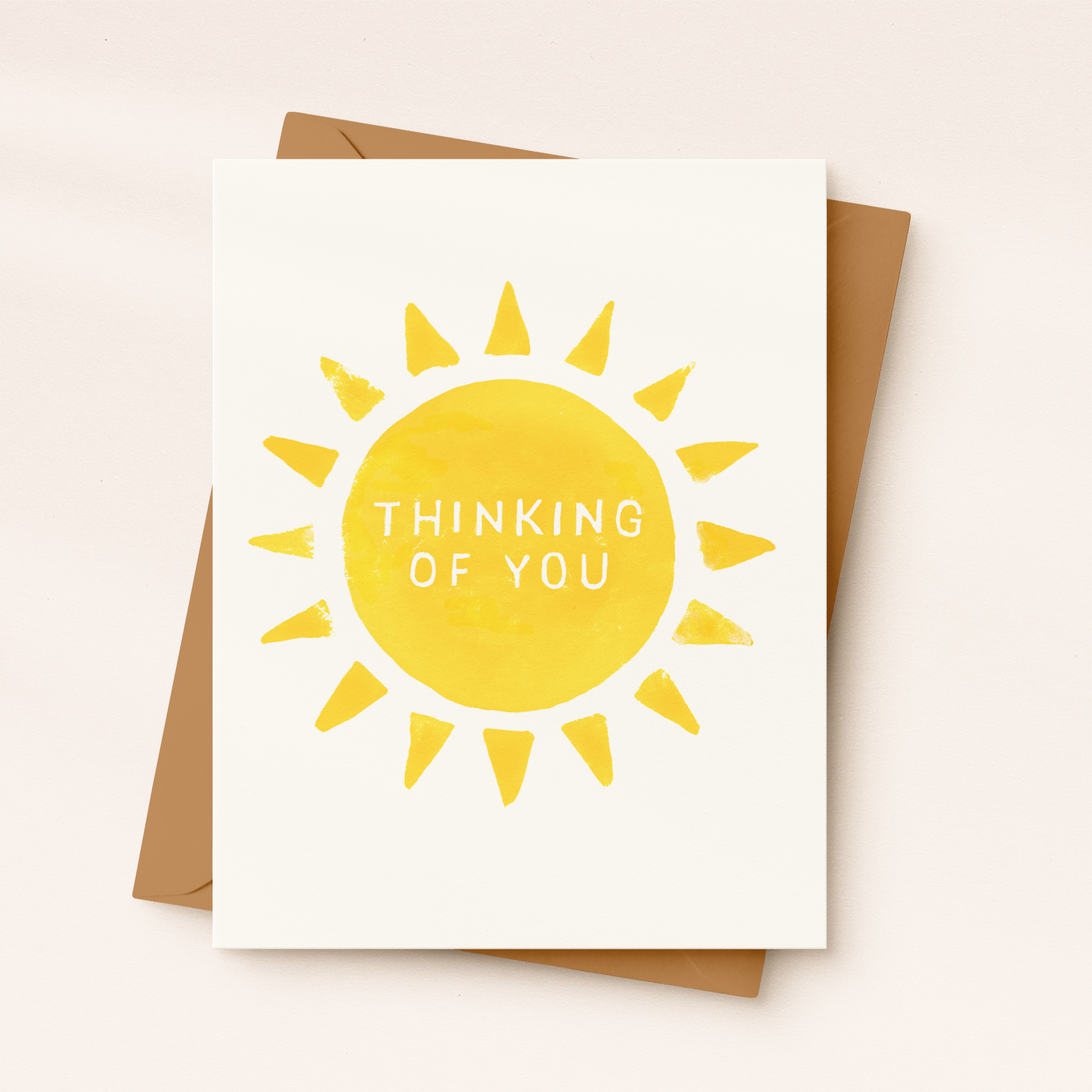 Flat printed greeting card ("Thinking Of You") featuring a teal and lime ombré wave background and hand lettering. All Bourne Paper Co. cards are blank inside and handmade in California.
