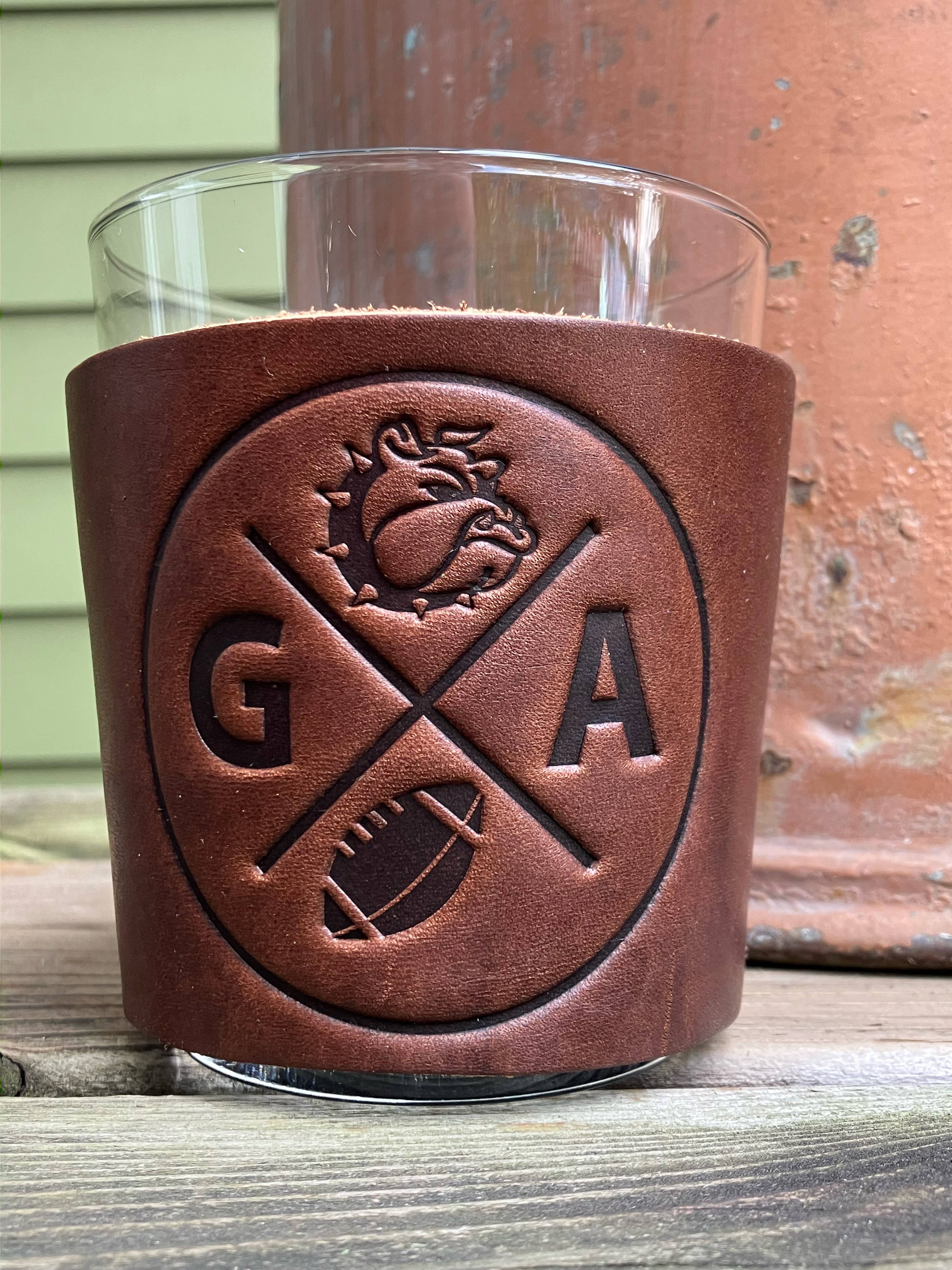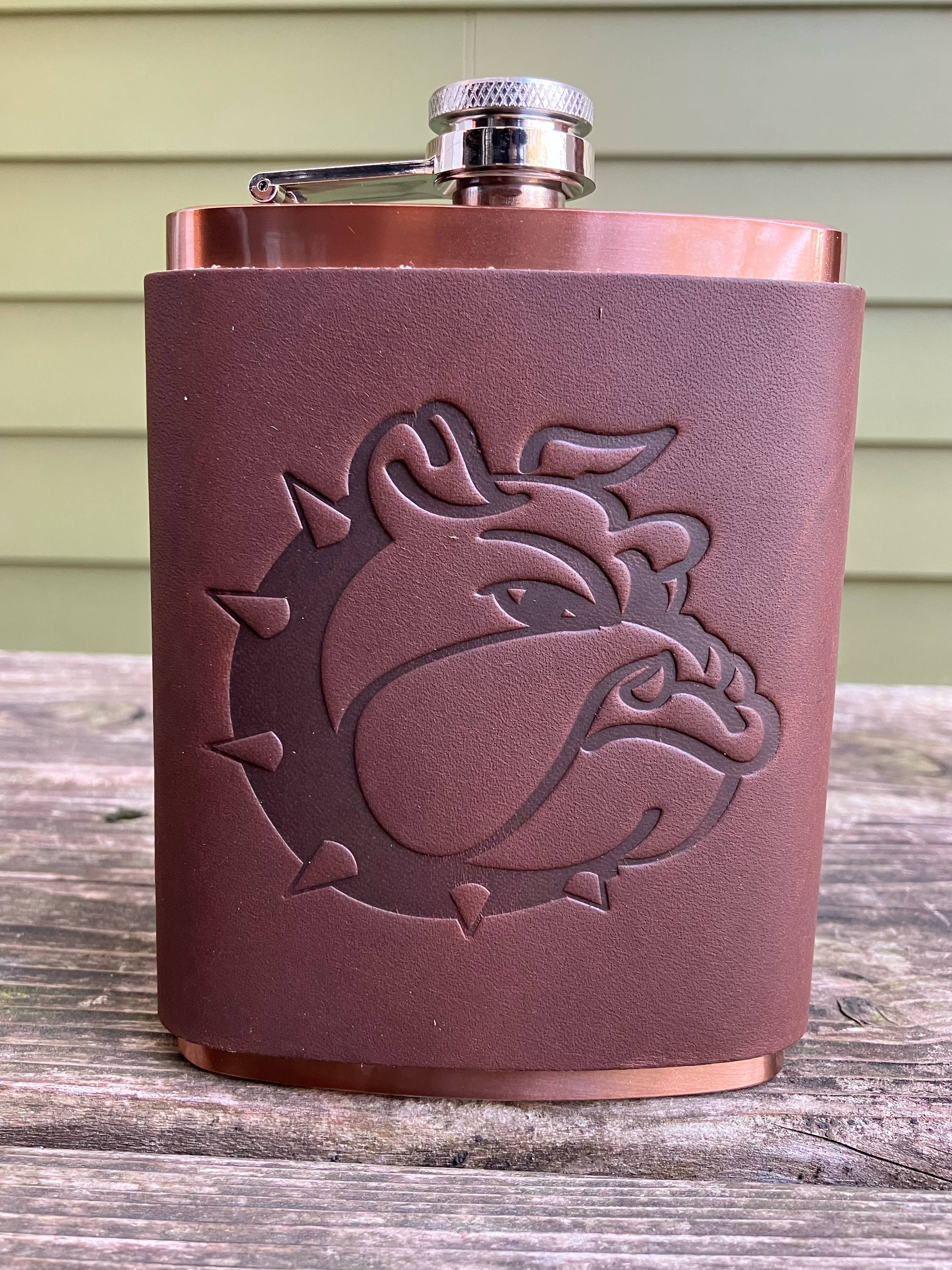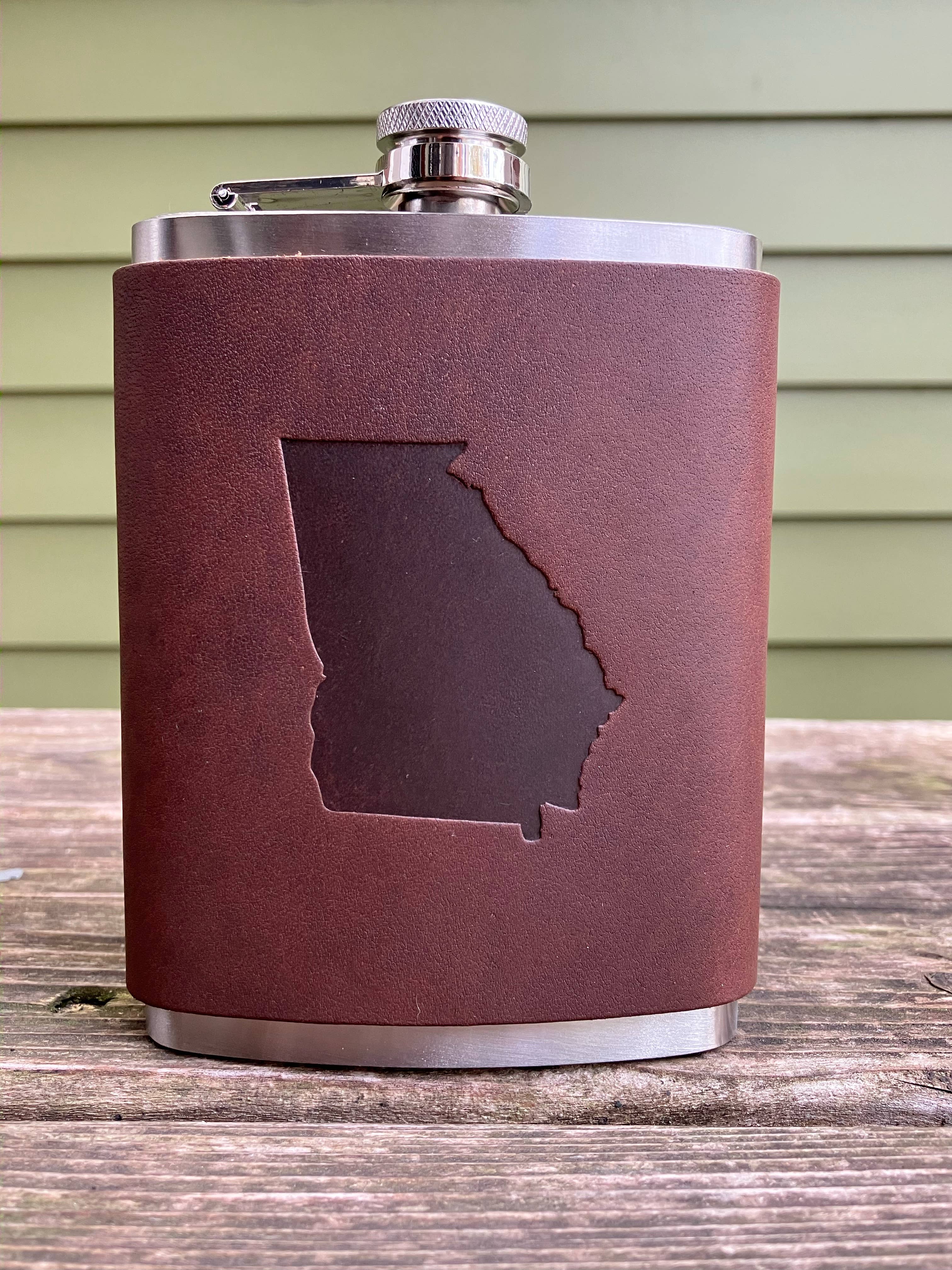 Leather Flask - Georgia Football Our Leather Wrapped flasks are fun, functional, gift-able, and good looking. We wrap an 8 ounce stainless steel flask (your choice copper coated or matte silver) with a leather sleeve that's hand stitched on the back. The flask has a hinged top attached. The leather is earthy, a perfect match stamped with one of our stock designs or create a custom design.