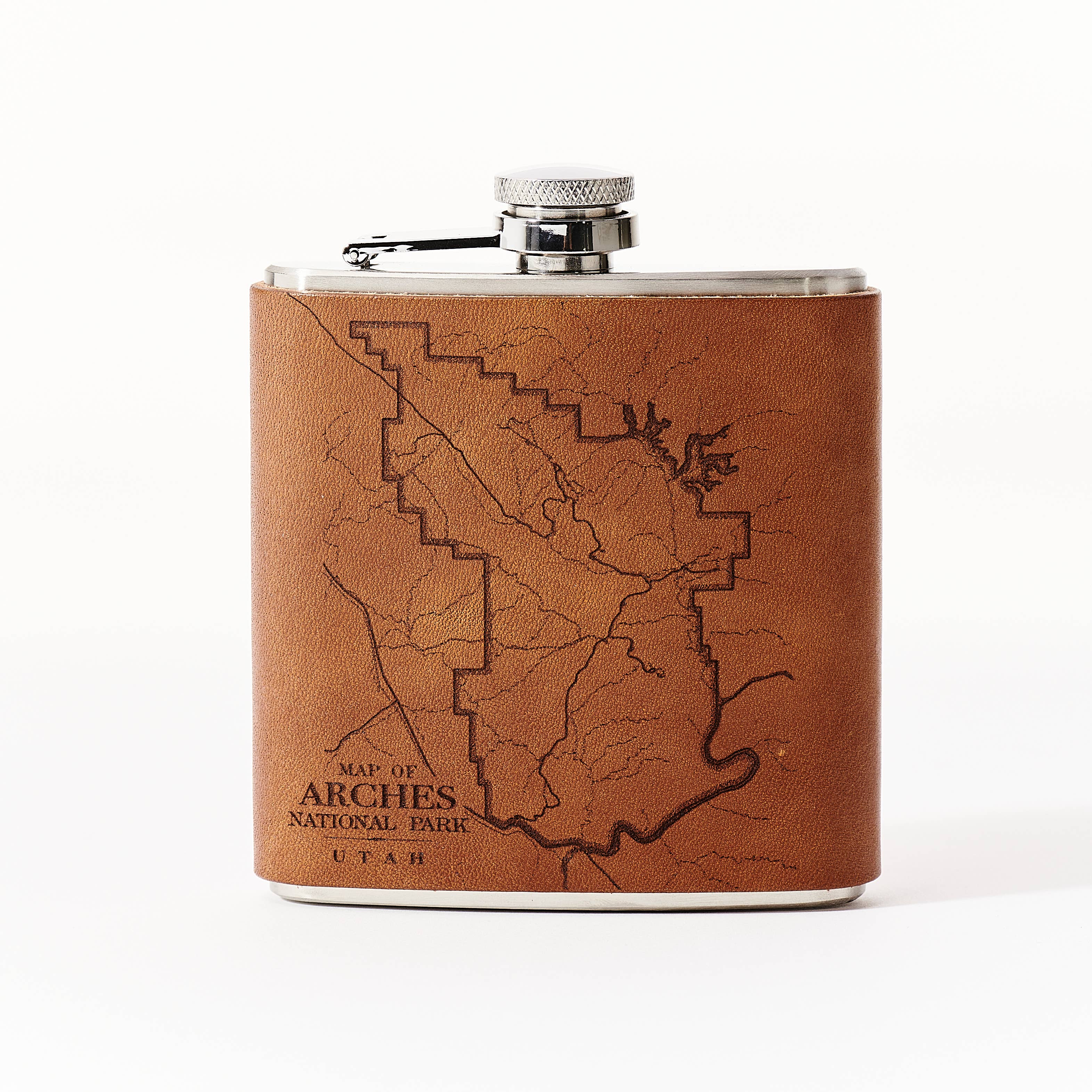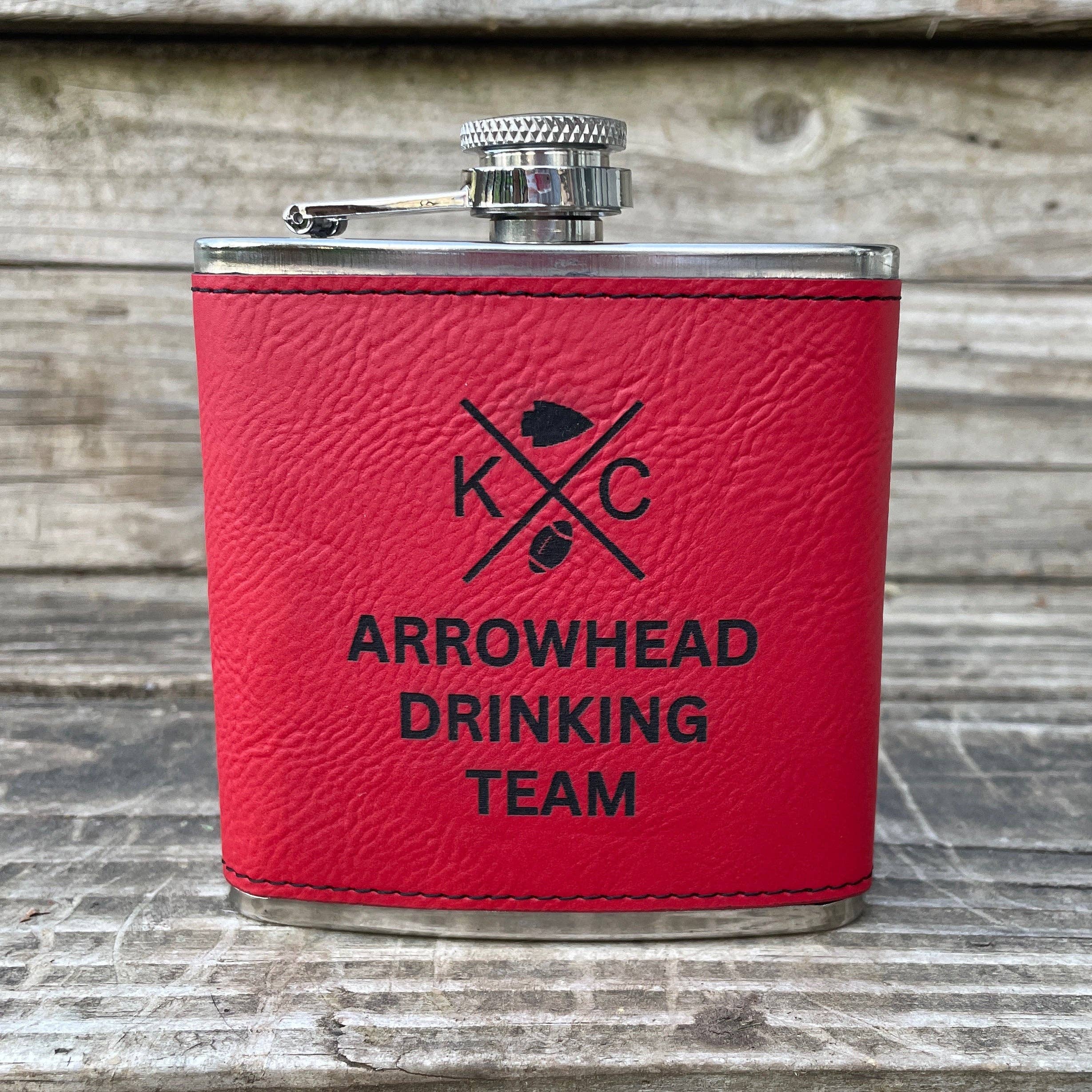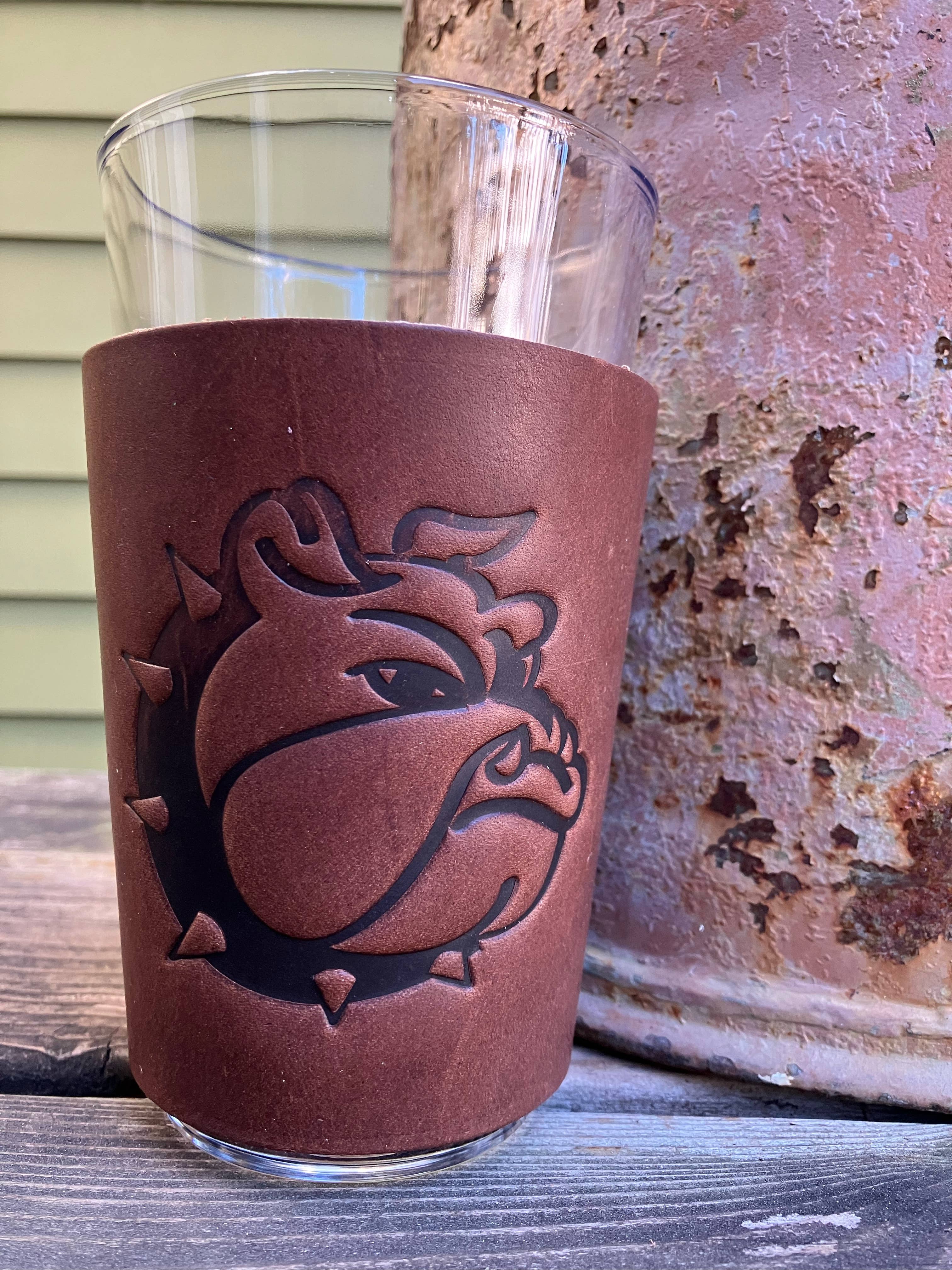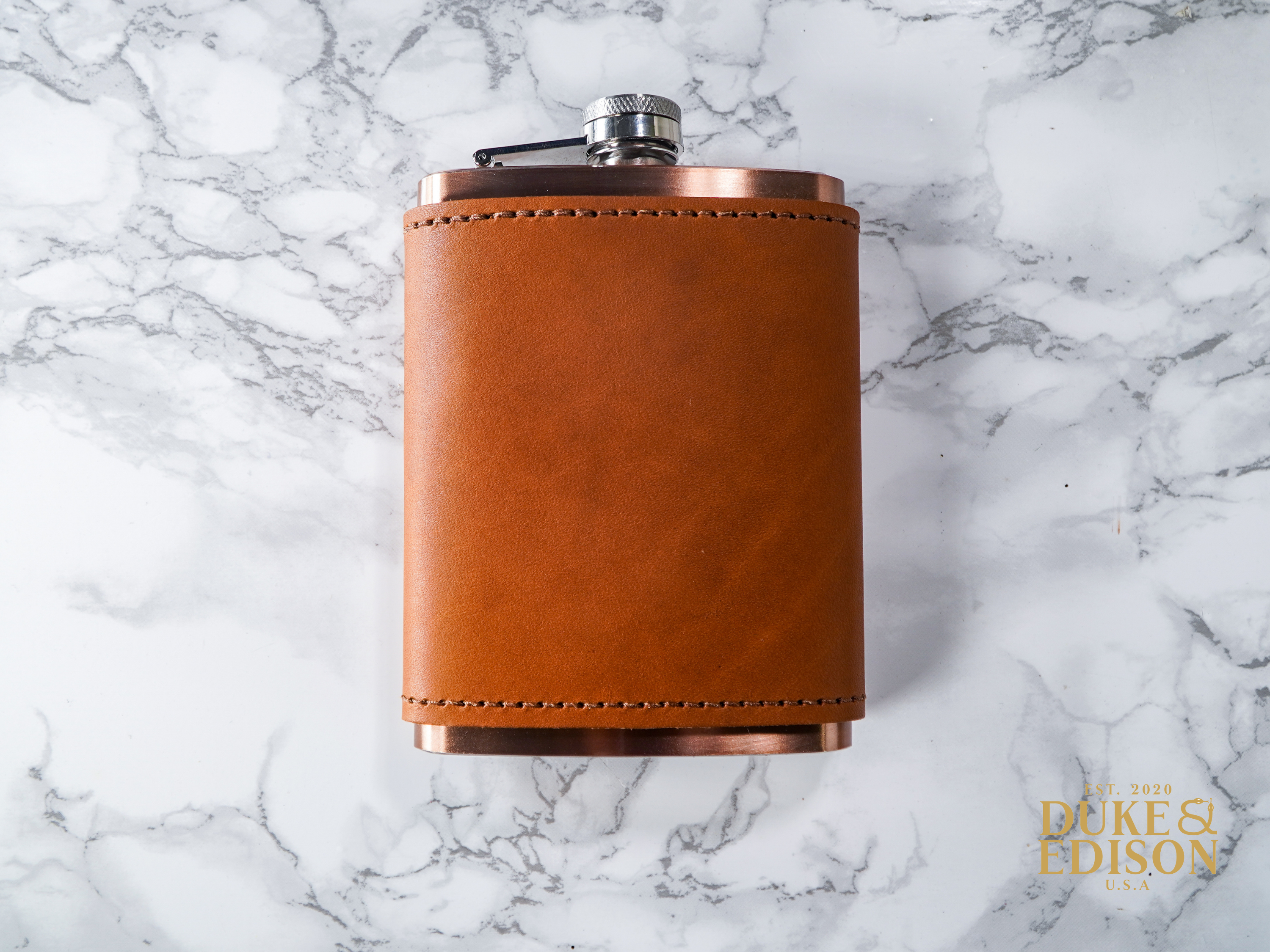 Leather Flask - Georgia Football Our Leather Wrapped flasks are fun, functional, gift-able, and good looking. We wrap an 8 ounce stainless steel flask (your choice copper coated or matte silver) with a leather sleeve that's hand stitched on the back. The flask has a hinged top attached. The leather is earthy, a perfect match stamped with one of our stock designs or create a custom design.
