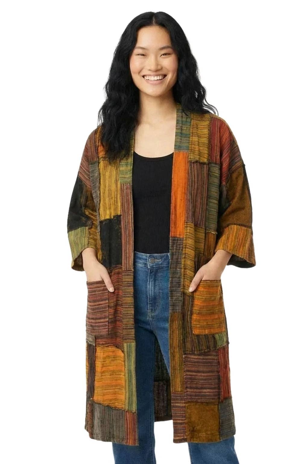 Elevate your boho wardrobe with the Zaga Kimono, a handcrafted, fair-trade cotton patchwork piece from Nepal. Featuring rich teal and purple hues with geometric and celestial patterns, it blends artistry and ethical fashion effortlessly. Why You’ll Love It: * Ethically Made: Fair trade certified and supporting Nepalese artisans * Unique Patchwork Design: Handcrafted with intricate geometric and celestial patterns * Lightweight & Breathable: 100% cotton for all-season comfort * Functional & Stylish: Relaxed open-front fit with spacious front pockets Available Sizes: One size fits most Colours: Teal, Purple Fabric: 100% Cotton Style Tip: Layer over casual outfits or festival wear for a bold, artistic statement while staying comfortable.