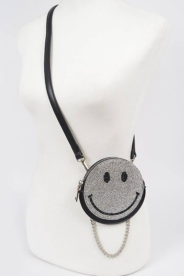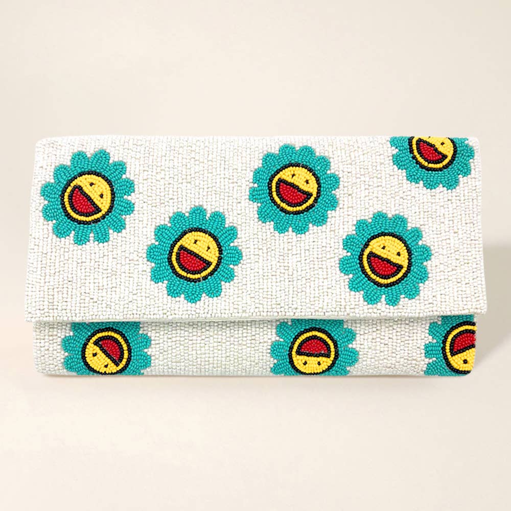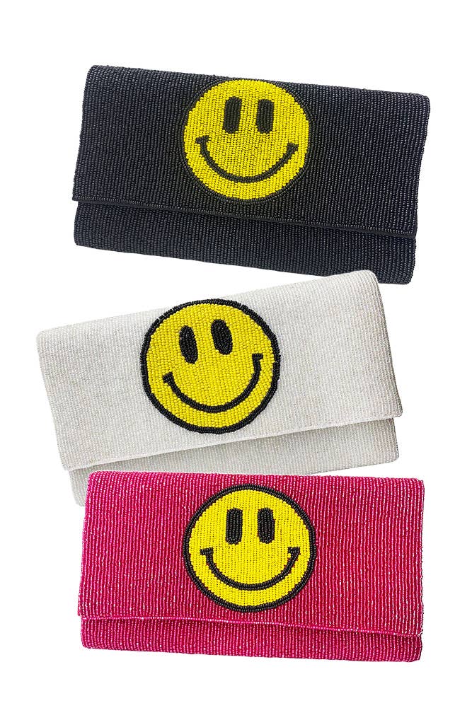 Smile Patterned Seed Beaded Clutch / Crossbody Bag • Bag Size : 10" X 5.5" • Chain Strap Size : 46" L (Detachable) • One Inside Slip Pocket • Magnetic Closure • Made In India A handcrafted seed-beaded clutch featuring a cheerful smiley face pattern on a vibrant background. Designed for both fun and function, this bag includes a secure flap closure and an optional gold chain strap for crossbody wear. Perfect for adding a playful touch to any outfit.