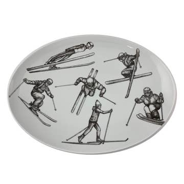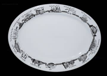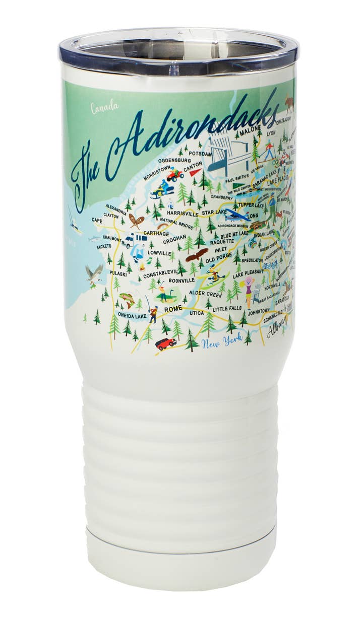 A whimsical depiction of the Adirondacks, highlighting notable towns and tourist attractions on a vibrant 16" oval melamine platter. Not for use in the microwave. Scratch and break-resistant. Dishwasher-safe.