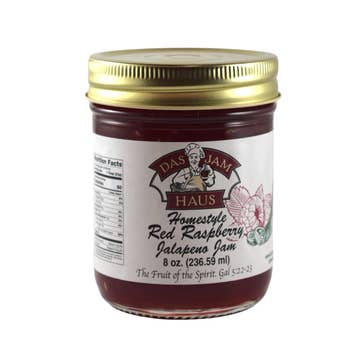 Made with sweet flavorful red raspberries and jalapenos, Mrs. Miller's Homemade Raspberry Jalapeno Jam packs the perfect amount of sweet and the perfect amount of spice. It will be the star of your party as an appetizer with cream cheese and crackers, or as a glaze on your next grilled pork chop. 9 oz Jar. Hand scooped in Ohio's Amish Country