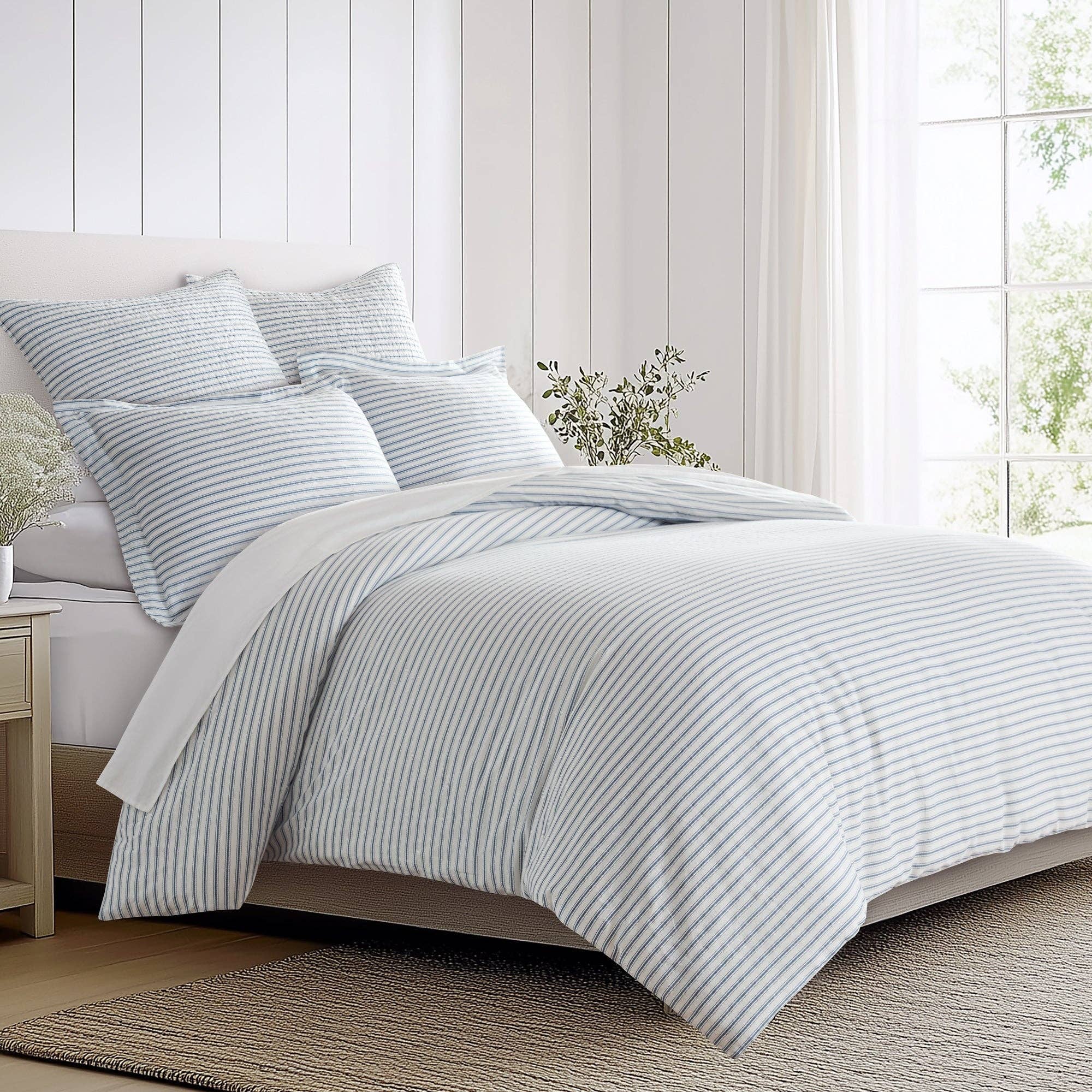 The Soft Ribbon Duvet Cover by iEnjoy Home® is designed with your comfort and style in mind. Give your old comforter or duvet insert a quick refresh with this reversible patterned duvet cover set. Made of the finest imported double-brushed microfiber yarns, creating a new standard in softness and breathability. Our premium yarns are twice as durable as cotton, wrinkle free, and perfect for all seasons. FEATURES: • Zippered closure and duvet corner ties • Superior weave for durability and a soft touch • Perfect option for those with allergies or sensitive skin • Fabric Contents: 100% 95 GSM Microfiber Polyester • Easy Care: Machine wash cold with similar colors. Do not add softener or bleach. Do not dry clean. Tumble dry low; remove promptly. • KING/CAL-KING: 108" x 96" Duvet Cover, 20" x 36" King Pillow Shams with 2" flange • FULL/QUEEN: 90" x 94" Duvet Cover, 20" x 26" Pillow Shams with 2" flange • TWIN/TWINXL: 70" x 90" Duvet Cover, 20" x 26" Pillow Sham with 2" flange
